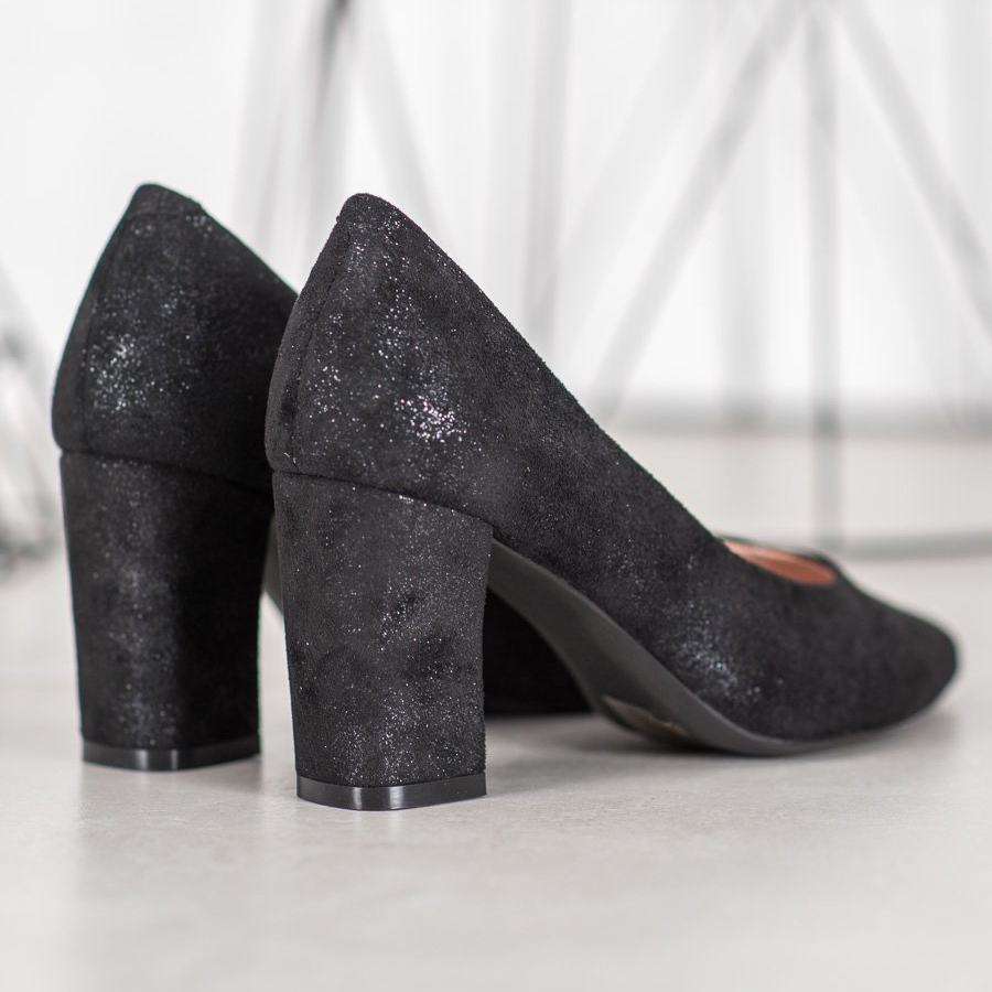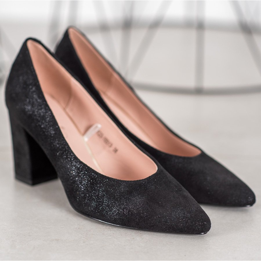 La hauteur du talon de 7,5 cm de type bloc assure la stabilité et le confort de port, ce qui rend ces escarpins parfaits pour un style quotidien. Fabriqués en cuir suédé écologique, ils offrent non seulement de l'esthétique, mais aussi de la durabilité. L'intérieur des chaussures est fini en cuir naturel, ce qui garantit le confort même en cas de port prolongé.