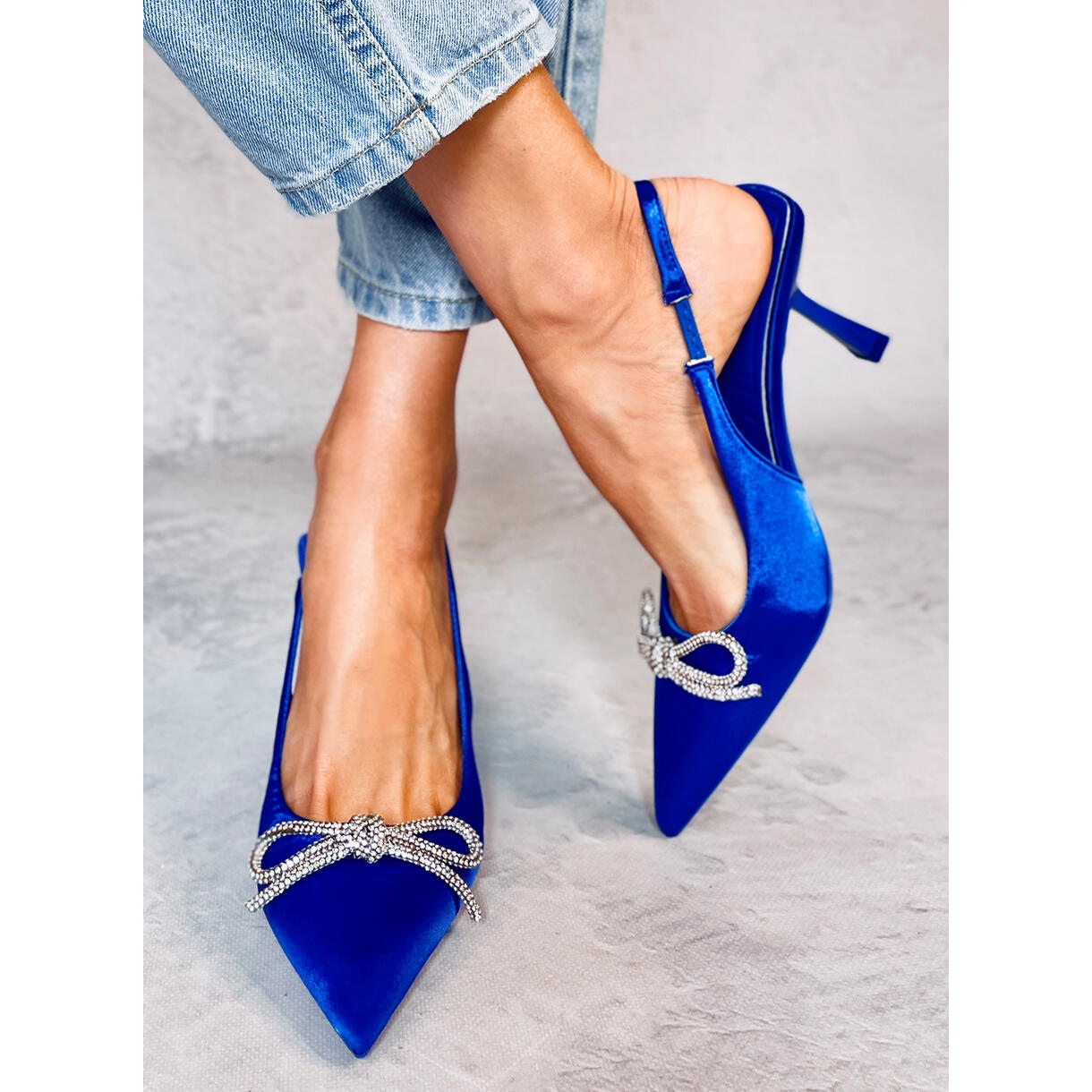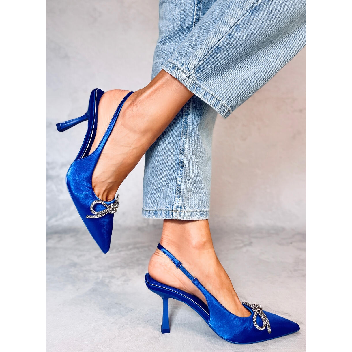 Le talon haut de 9 cm affine parfaitement la silhouette, soulignant les formes féminines. Les escarpins sont fabriqués dans un tissu doux, ce qui les rend non seulement beaux, mais également confortables à porter. De plus, un nœud décoratif avec des pierres brillantes leur confère un caractère unique, soulignant l'élégance de l'ensemble du modèle.