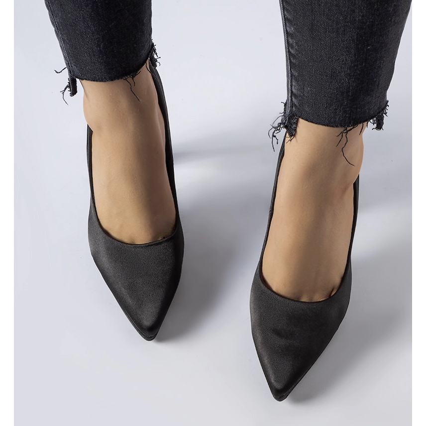 Détails: Escarpins à talons aiguilles en satin noir par Rivers le noir