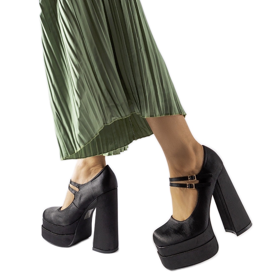Pompes noires sur un poteau élevé Gabriel - Élégance qui allonge la figure. Le modèle G856 est fait de tissu satiné doux en noir uniforme et profond. La caractéristique et revêtu de 14,5 cm de haut avec une plate-forme supplémentaire et un orteil carré arrondi forment une figure moderne et stable. Les sangles minces fixées avec de petites boucles ajoutent un accent féminin et maintiennent en toute confiance le pied. L'insert en cuir écologique garantit le confort et la semelle en plastique garantit la durabilité.