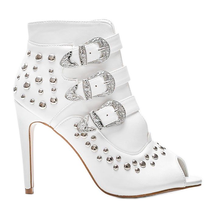 Nous vous présentons les escarpins à talons hauts Abigail blancs, qui allient élégance et style unique. Ces talons hauts se distinguent par une belle finition, grâce à des clous décoratifs et des boucles ornementales accrocheuses qui leur donnent du caractère. Les boucles sont fixées sur des rubans élastiques, ce qui assure un ajustement parfait au pied et un confort de port.