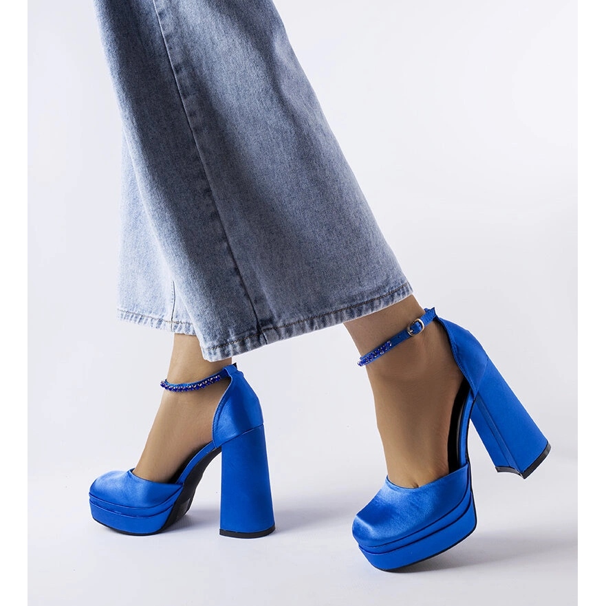 Les chaussures sont fabriquées en cuir écologique de haute qualité en bleu, désignées par le fabricant comme "Bleu". Le talon de ces escarpins est un bloc de 12 cm de haut.