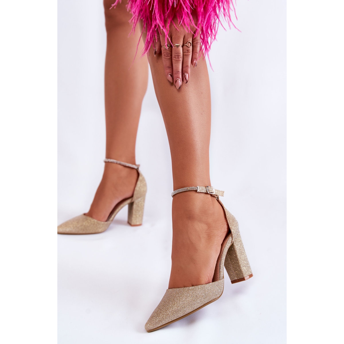 Découvrez l'élégance et le style avec les escarpins PS1 d'une couleur dorée éclatante ! Ces chaussures à la mode avec un talon bloc stable correspondent parfaitement aux tendances actuelles et offrent en même temps confort et confiance dans votre démarche. Fixés autour de la cheville grâce à une bride réglable ornée de strass, ces escarpins à bout pointu sont parfaits pour une soirée, un dîner romantique ou une fête élégante.