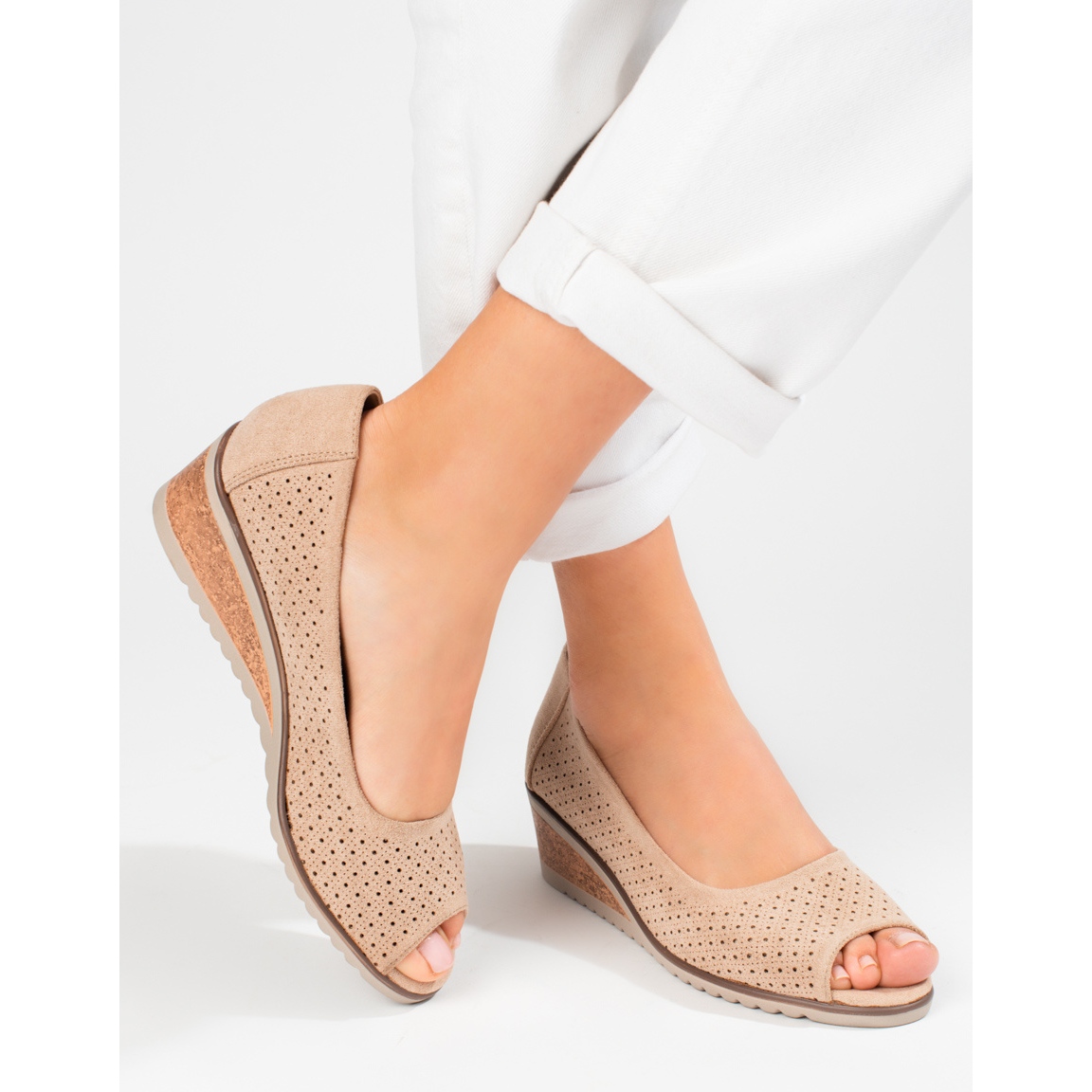 Le talon compensé de 5 cm de haut ajoute non seulement de la légèreté à la silhouette, mais garantit également un confort au quotidien et lors de la marche. La finition ajourée ajoute de l'élégance et le cuir écologique en daim rend les escarpins à la fois élégants et respectueux de l'environnement.