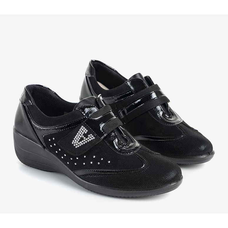 Découvrez l'élégance et le confort avec les chaussures compensées noires Merante, parfaites pour les femmes modernes qui apprécient le style et le confort. Fabriquées en éco-cuir suédé de haute qualité, ces chaussures se caractérisent par de subtiles décorations en éco-cuir verni et strass, qui leur confèrent un charme unique.