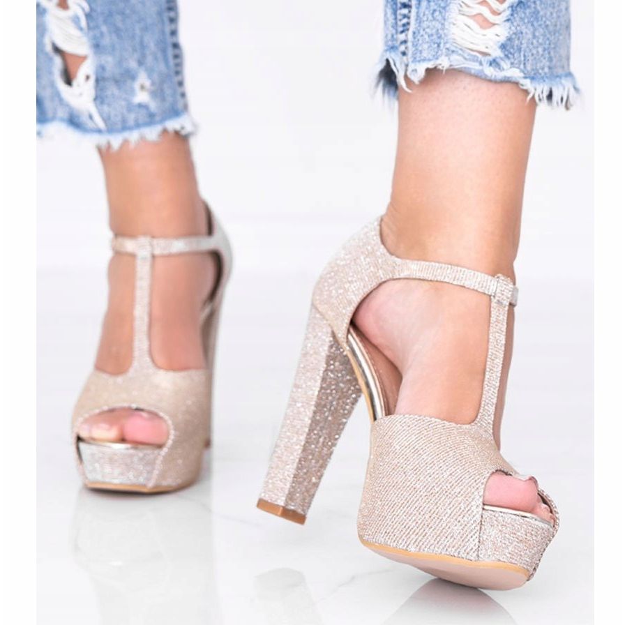 Les pompes sont disponibles en numérotation standard, ce qui facilite le choix de la bonne taille. L'intérieur des chaussures est en cuir écologique, ce qui les rend respectueuses de l'environnement. La semelle en plastique beige les rend modernes et se marie parfaitement avec la couleur dorée.