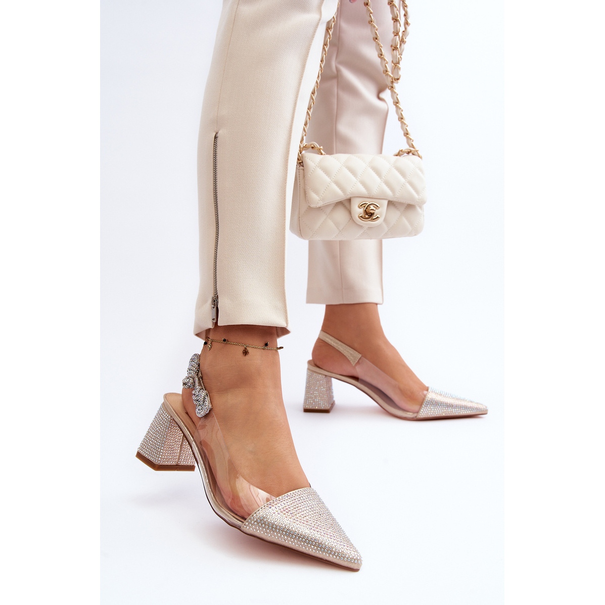 Les escarpins dorés ont également des bouts élégamment pointus, qui affinent optiquement les jambes, créant une silhouette séduisante. Ce sont des détails qui comptent et ajoutent un caractère unique à l’ensemble.