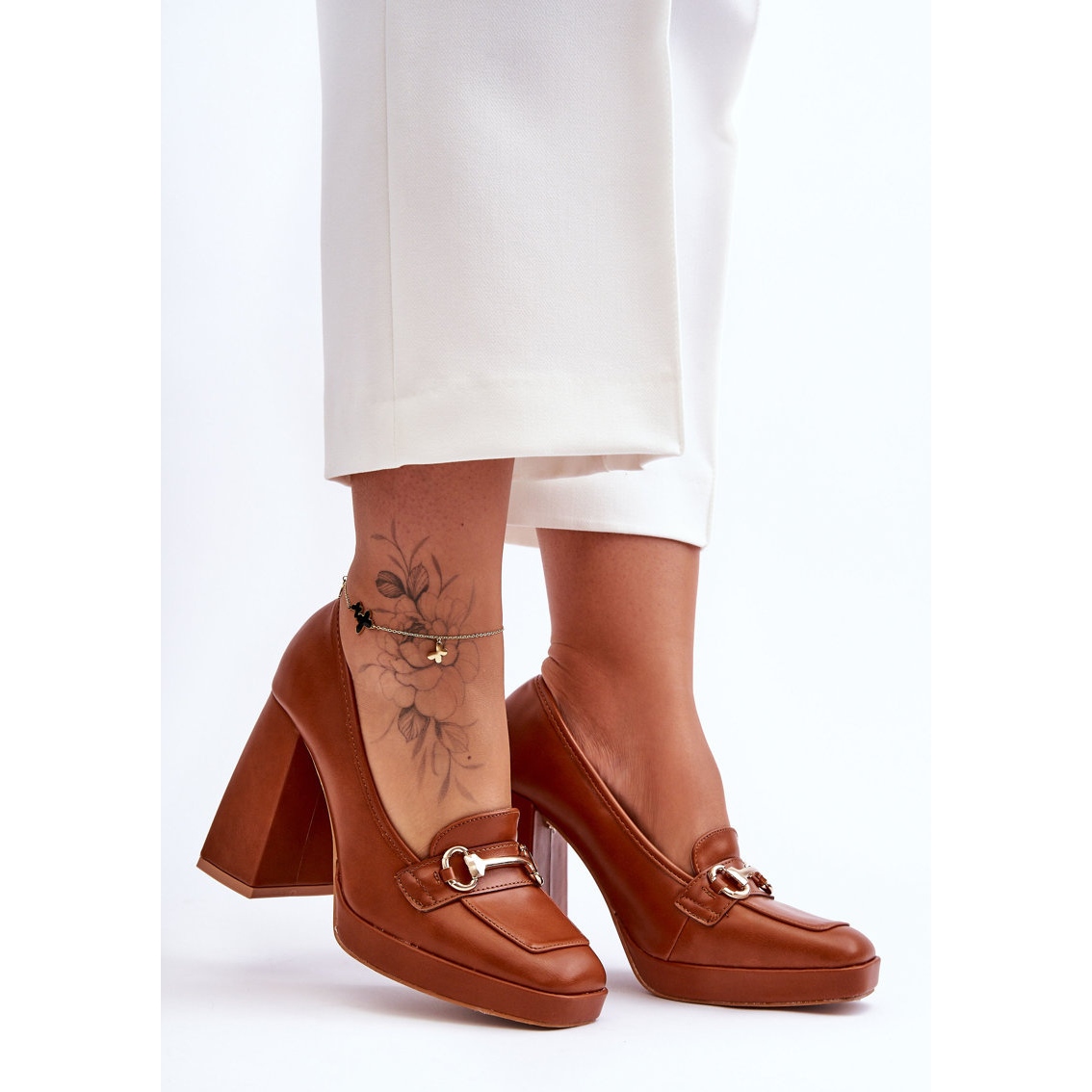 Les escarpins sont conçus avec un talon massif en forme de bloc de 10,5 cm, qui ajoute de l'élégance et est confortable pour le pied en même temps. De plus, ces modèles ont une plate-forme délicate d'une hauteur de 1,5 cm, ce qui augmente la stabilité de la chaussure.