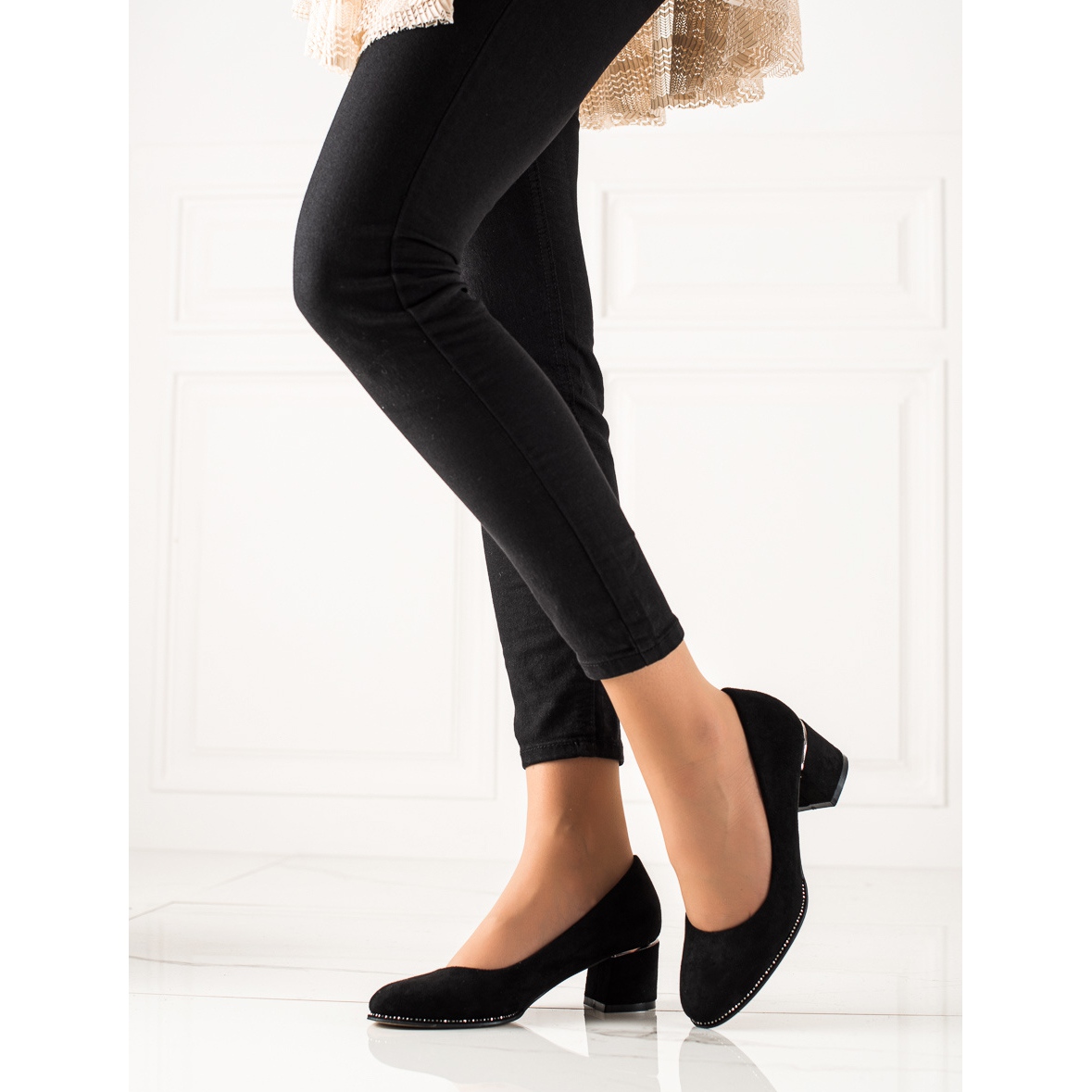 Fabriqués à partir de faux suède écologique, ces escarpins combinent un style classique avec une touche moderne. Les strass délicats leur ajoutent de la brillance, ce qui en fait un ajout élégant à n'importe quel style. Le bout rond et le talon bloc de 5 cm de haut assurent stabilité et confort de port, ce qui en fait un choix idéal pour toutes les saisons : printemps, été, automne ou hiver.