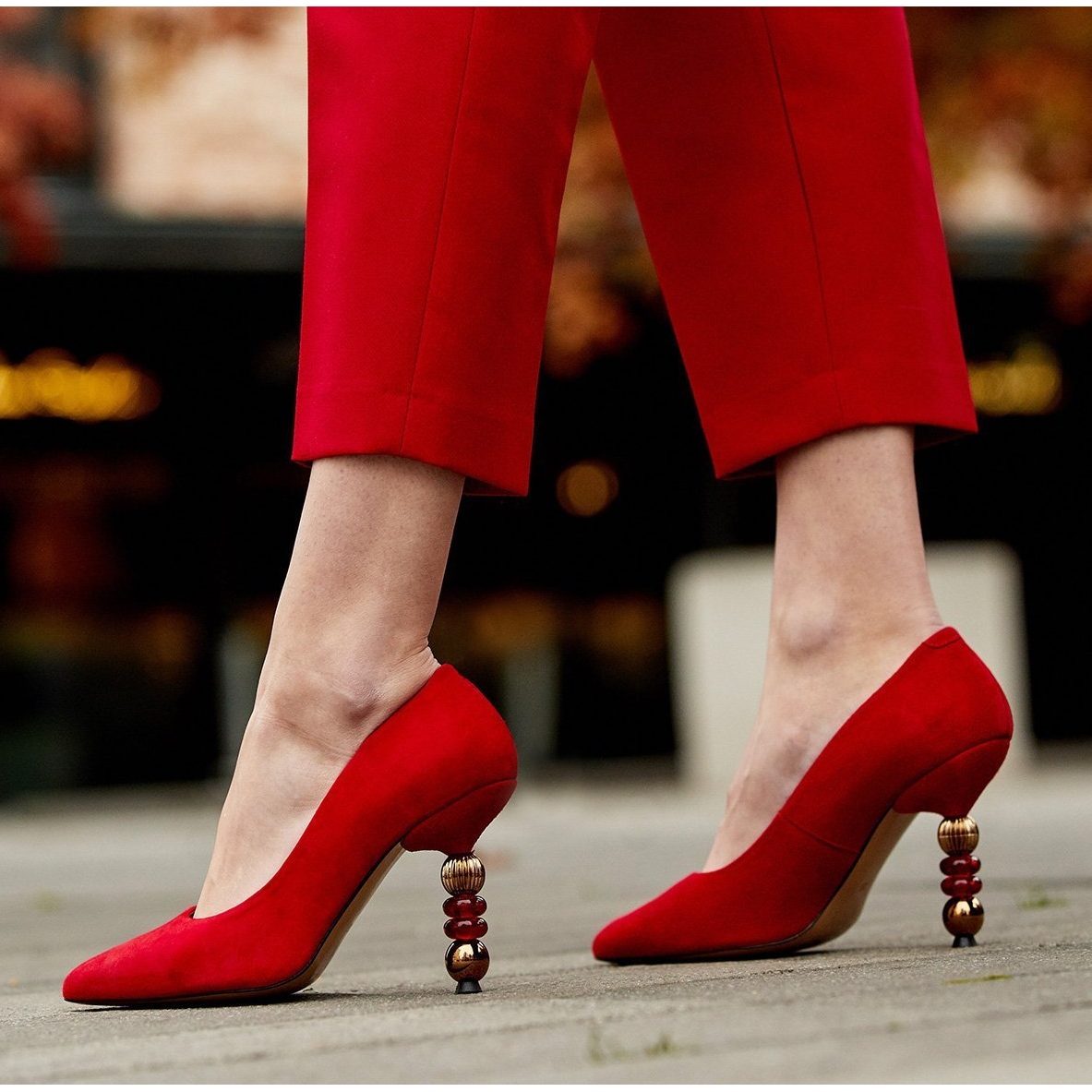 La tige est en cuir suédé naturel, synonyme de luxe et de durabilité. La couleur rouge des chaussures est une garantie d'attirer l'attention et d'ajouter de la confiance en soi dans toutes les situations. Les pierres décoratives placées avec précision attirent le regard et ajoutent de la splendeur sans exagération.