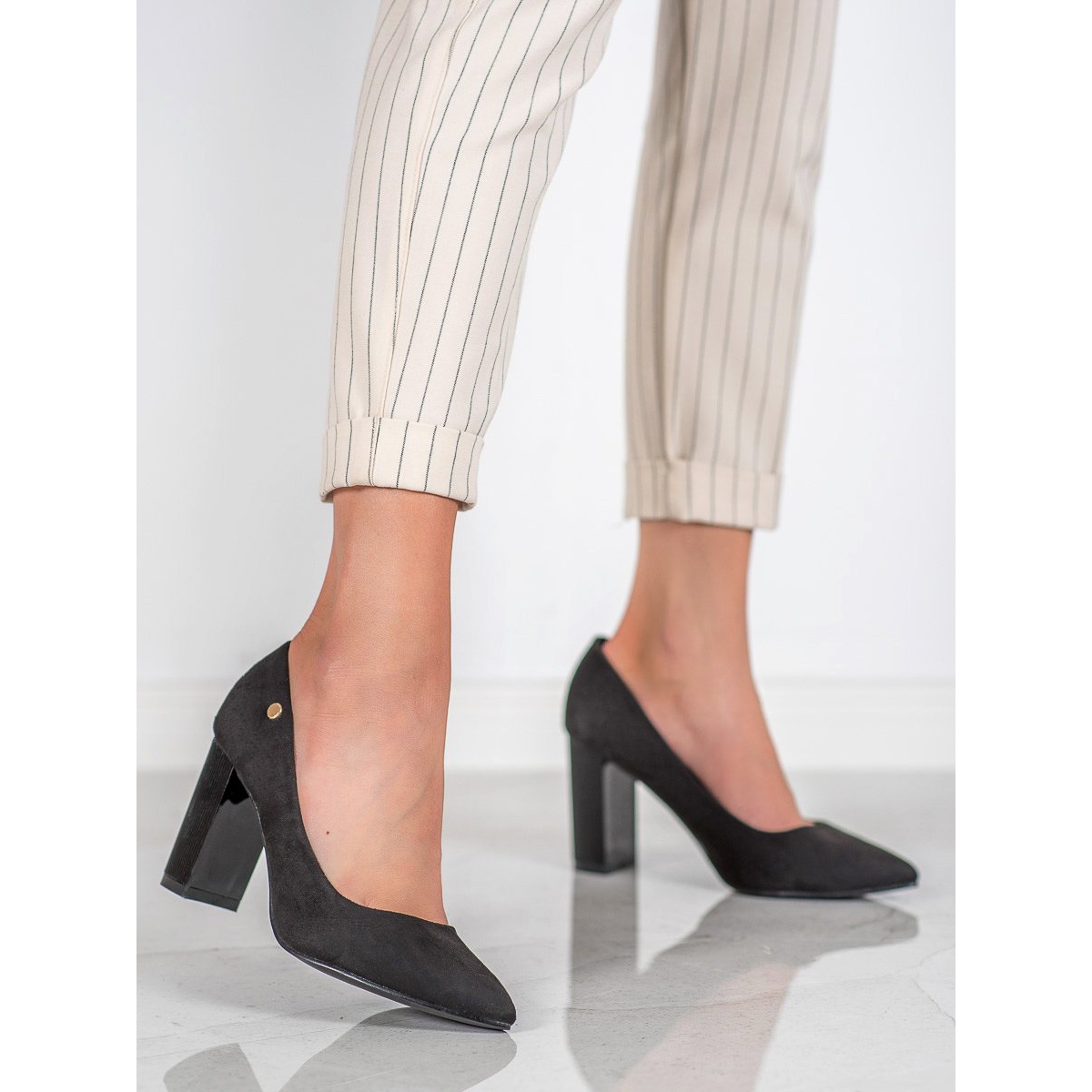 L'utilisation d'un talon bloc d'une hauteur de 8,5 centimètres ajoute non seulement du style, mais assure également la stabilité, ce qui rend les escarpins pratiques et confortables pour un usage quotidien. La texture inhabituelle du talon leur confère de l'originalité, et le bout rond classique complète harmonieusement l'ensemble.