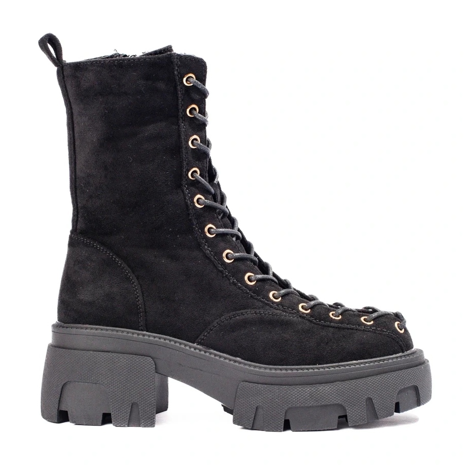 Travailleurs noirs élégants et durables, en daim écologique. Parfait pour les journées plus fraîches grâce à l'isolation et à l'insertion de "couverture de chaussures". La combinaison de style décontracté et rock fait correspondre parfaitement les chaussures tous les jours et les stylisations plus expressives.