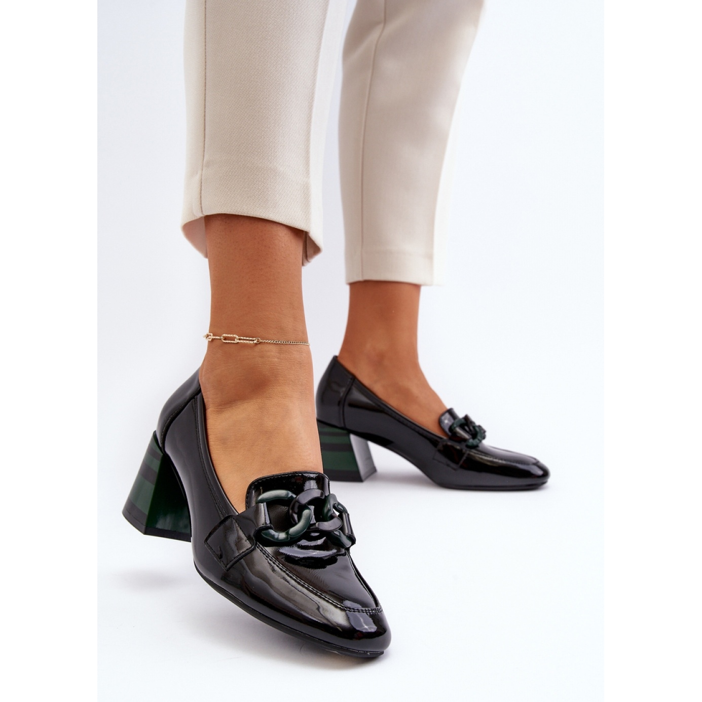 Dotées d'un talon bas de 6,5 cm, ces chaussures offrent stabilité et excellent maintien, ce qui en fait un excellent choix aussi bien pour le bureau que pour diverses fêtes de famille. Un avantage supplémentaire est une décoration subtile sous la forme d'une chaîne placée sur le devant de la tige, qui leur confère un caractère unique et un accent élégant.