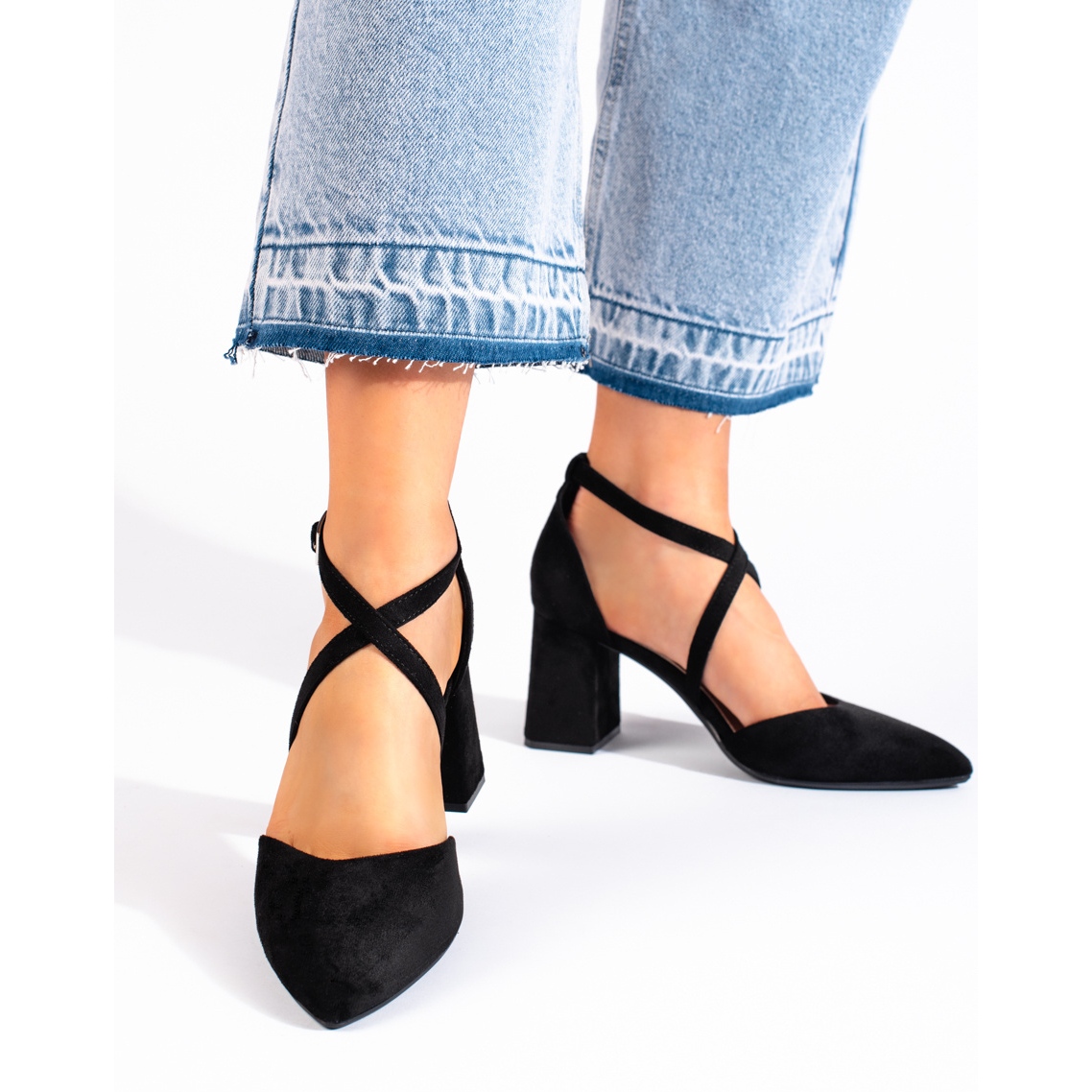 La semelle en plastique lisse assure la stabilité de la marche, et le talon fermé combiné à la boucle assure un confort de port et un ajustement parfait au pied. Le bout pointu donne du caractère aux chaussures et allonge optiquement les jambes, ce qui est un avantage supplémentaire de ce modèle. Le talon bloc de 8 cm de haut est stable et confortable, ce qui vous permet de conserver l'élégance sans compromettre le confort.