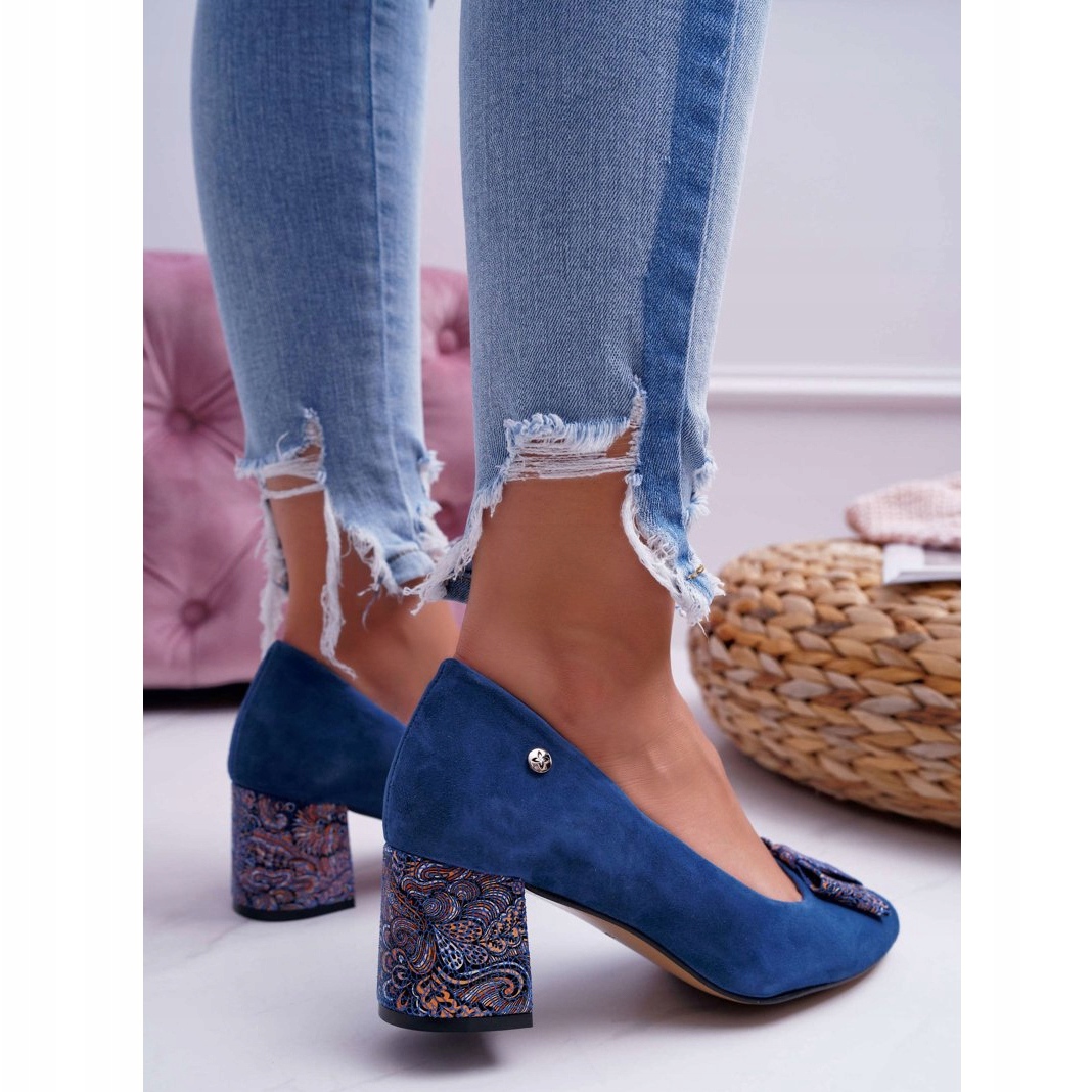 Nous vous présentons les élégants escarpins pour femmes Maciejka Suede Navy Blue 3356A-17/00-1, qui séduisent par leur design unique et leur finition soignée. Ces belles chaussures au talon délicat se distinguent par de subtiles décorations florales sur le talon et un nœud, qui leur confèrent un caractère unique.