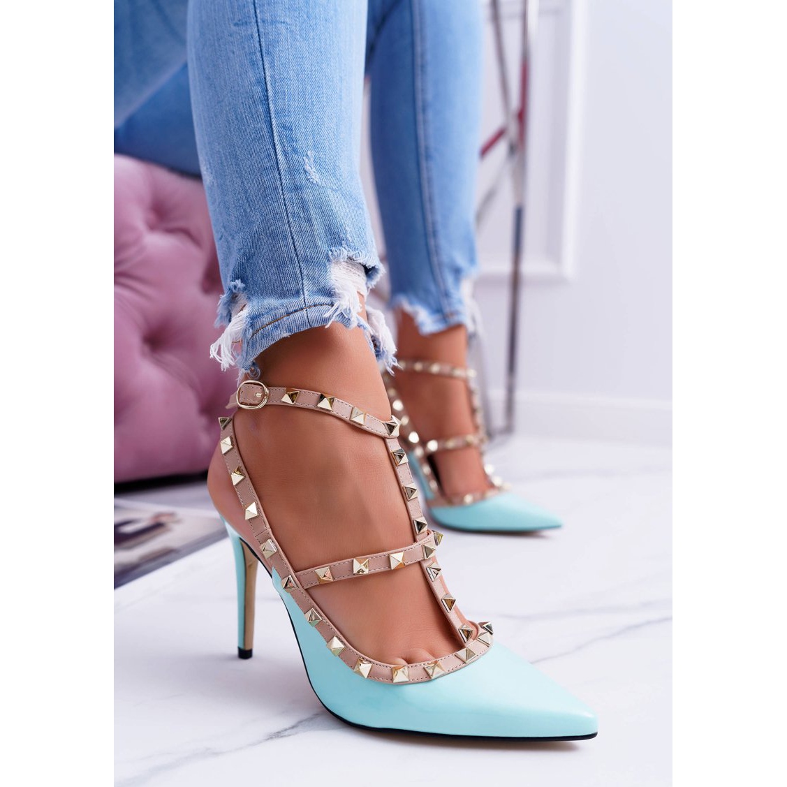 Découvrez des talons aiguilles vernis pour femmes VICES uniques dans une belle teinte bleue avec des décorations en forme de clous et de strass. Parfaits pour les journées d'été, ces escarpins élégants se marient parfaitement aussi bien avec des shorts courts qu'avec des robes aériennes, ajoutant un caractère sensuel à n'importe quel style.