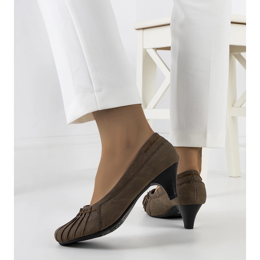 Fabriqués en éco-cuir de haute qualité, ces escarpins séduisent par une décoration subtile en forme de volants sur le devant de la tige. Grâce à leur couleur marron kaki classique, ils s'intégreront parfaitement dans différents styles, aussi bien au quotidien qu'au travail. Le plastique noir utilisé pour fabriquer la semelle assure durabilité et stabilité, et la semelle intérieure en cuir écologique garantit un confort de port tout au long de la journée.