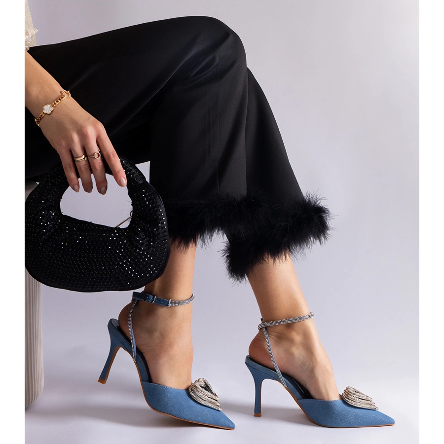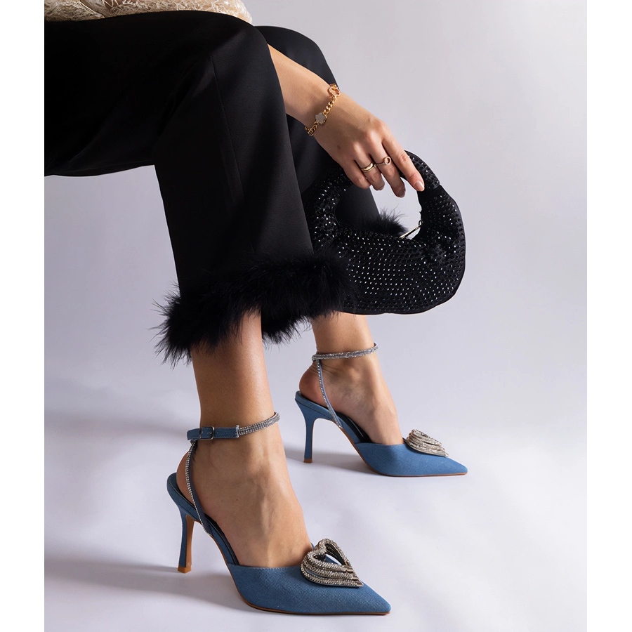 Détails: Escarpins hauts bleus à talon ouvert ornés de zircons