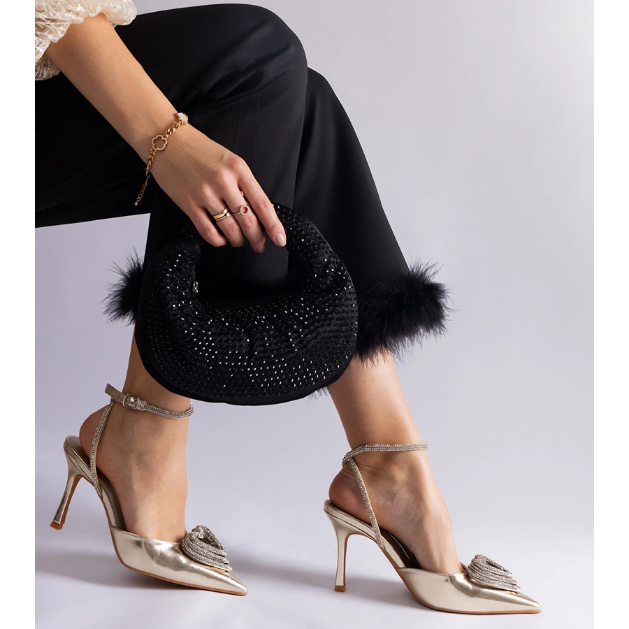 Escarpins hauts dorés à talon ouvert ornés de zircons