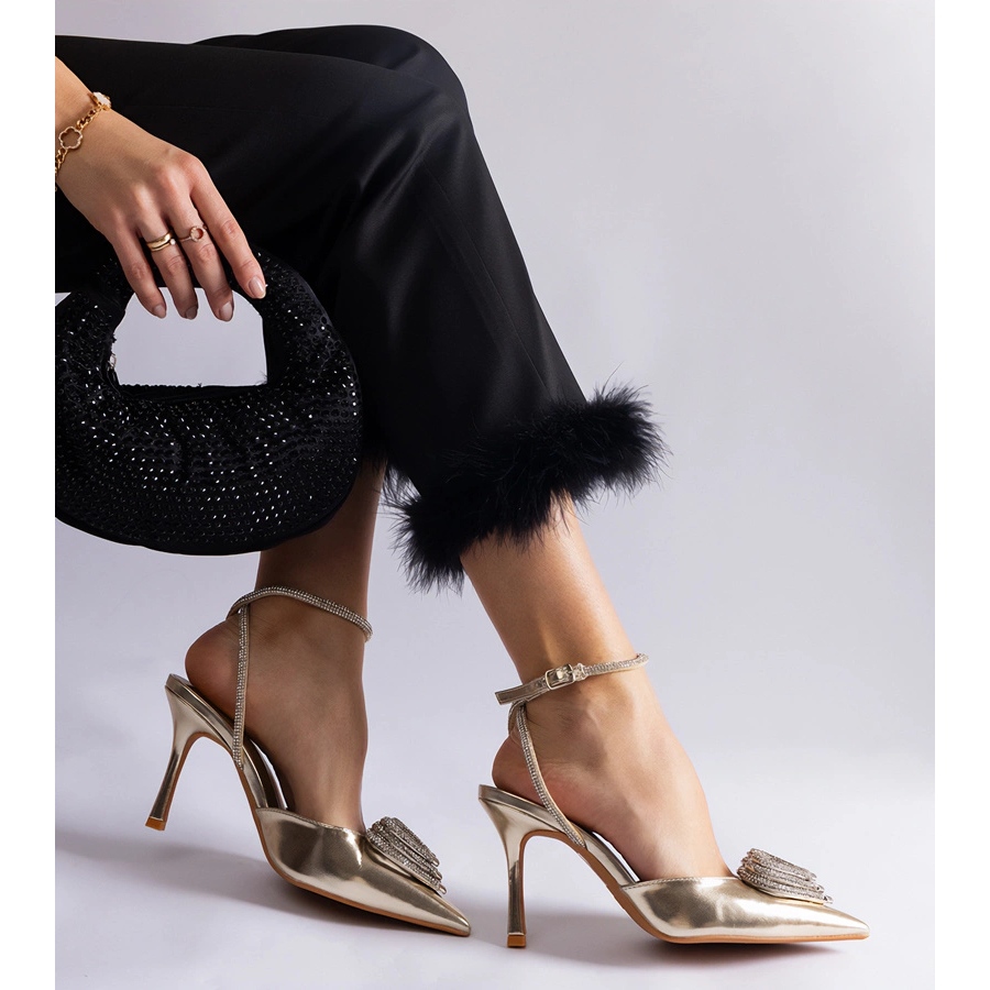Détails: Escarpins hauts dorés à talon ouvert ornés de zircons d'or