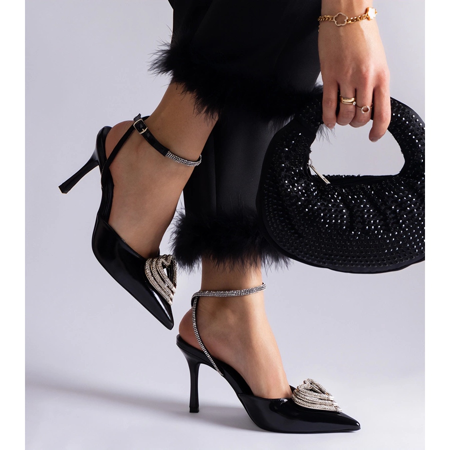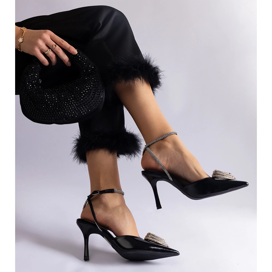 Détails: Escarpins hauts noirs à talon ouvert ornés de zircons le noir
