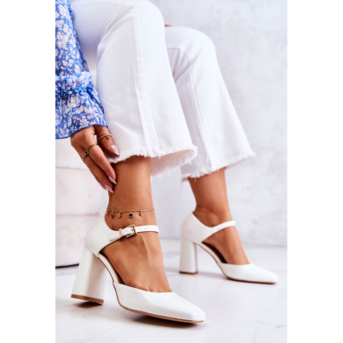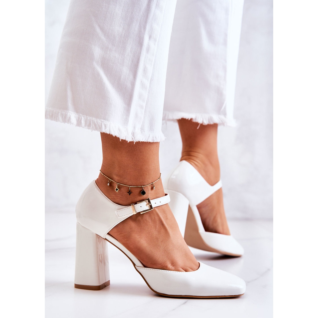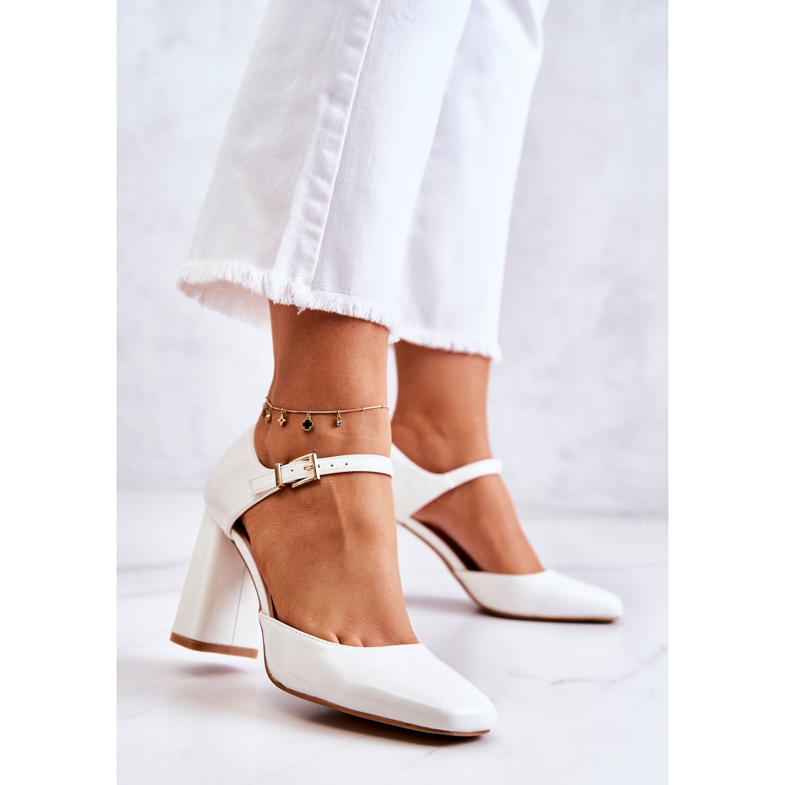 Ces escarpins s'attachent autour de la cheville à l'aide d'une bride réglable munie d'une boucle, qui permet un ajustement parfait à n'importe quelle jambe. Le nez carré leur donne un caractère moderne, tandis que la couleur blanche en fait un élément universel de tout style. Ils s'associent parfaitement aussi bien avec un pantalon large élégant qu'avec une robe style veste.