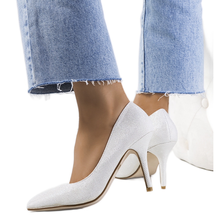 Découvrez l'élégance et la classe qui découlent des talons hauts Macerra blancs brillants. Ces escarpins uniques ont été créés pour les femmes qui souhaitent mettre en valeur leur beauté et leur confiance en elles. La structure délicate du matériau et l'éclat subtil des paillettes forment une combinaison parfaite qui attirera certainement l'attention.