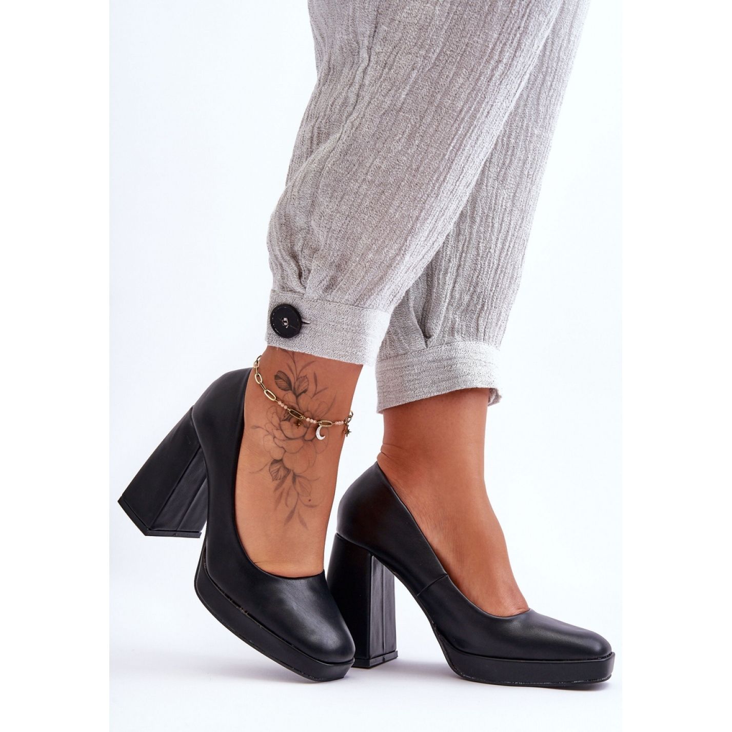 Un bloc stable et supérieur d'une hauteur de 10,5 cm et une plate-forme délicate d'une hauteur de 2 cm offrent un confort de port inégalé, ce qui en fait une excellente solution à la fois pour le travail et diverses sorties, telles que des événements ou des réunions importantes. Le nez carré à la mode leur donne un personnage moderne, et le talon raidi les rend parfaitement s'adapter au pied.