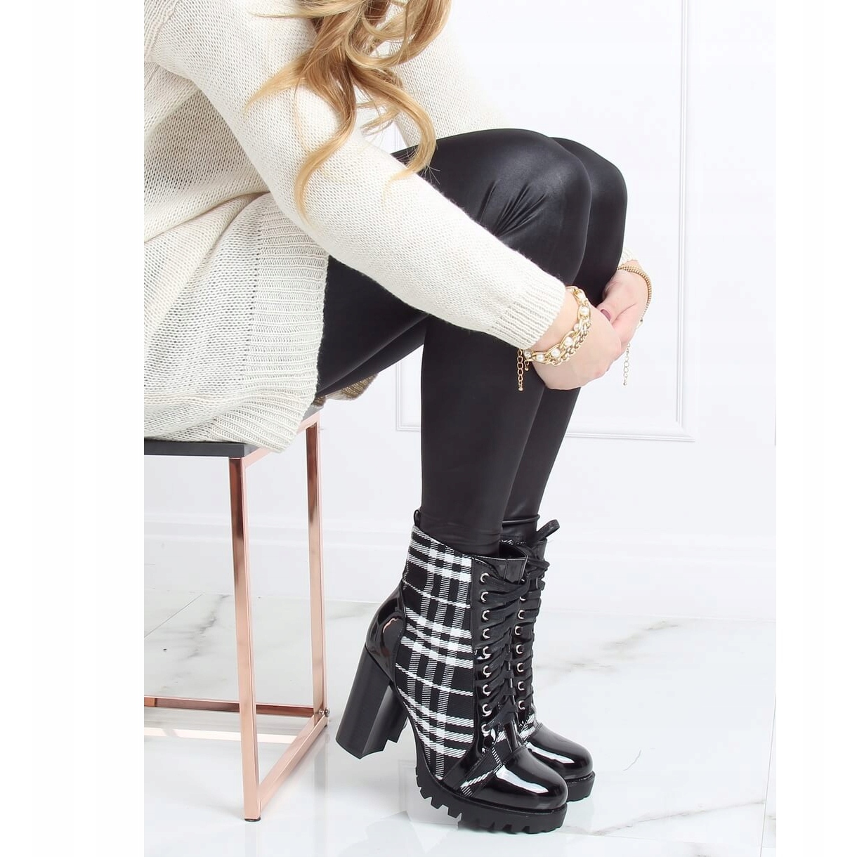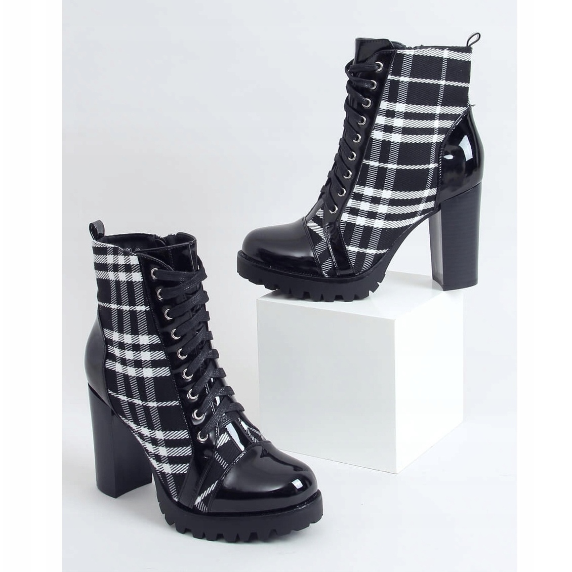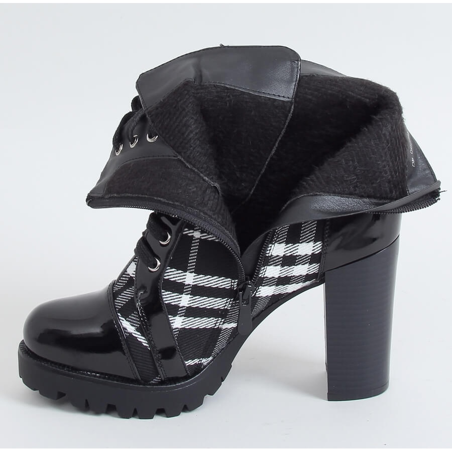 Leur aspect unique est dû au motif à carreaux à la mode et aux inserts laqués qui attirent l'attention et donnent de l'originalité aux chaussures. Grâce au laçage traditionnel et à une fermeture éclair pratique sur le côté de la tige, enfiler et enlever ces bottes est un pur plaisir. L'intérieur des chaussures est doublé d'une fourrure délicate, qui assure chaleur et confort tout au long de la journée.