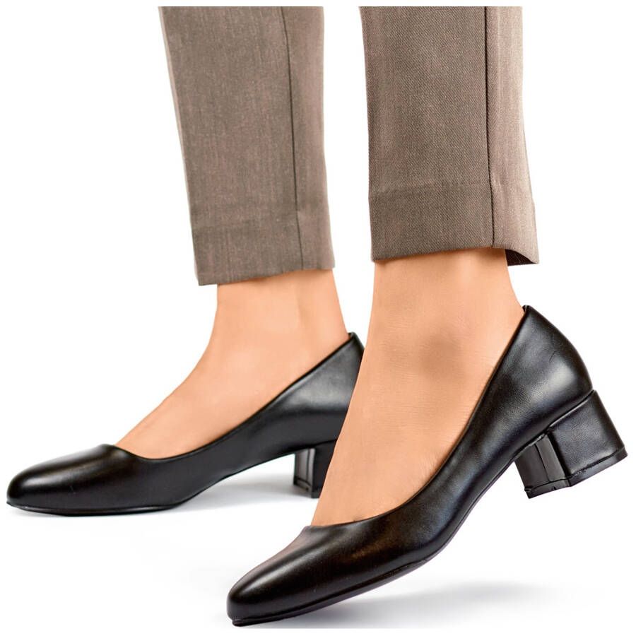 Ce modèle est caractérisé par un talon bas sous la forme d'un bloc de haut de 4 cm, ce qui garantit le confort de porter toute la journée. Le nez rond ajoute une subtilité, et la coupe insérée permet de mettre et de décoller des chaussures faciles. La peau extérieure écologique dans une couleur noire intemporelle fait que ces pompes se mélangent parfaitement dans la plupart des styles.