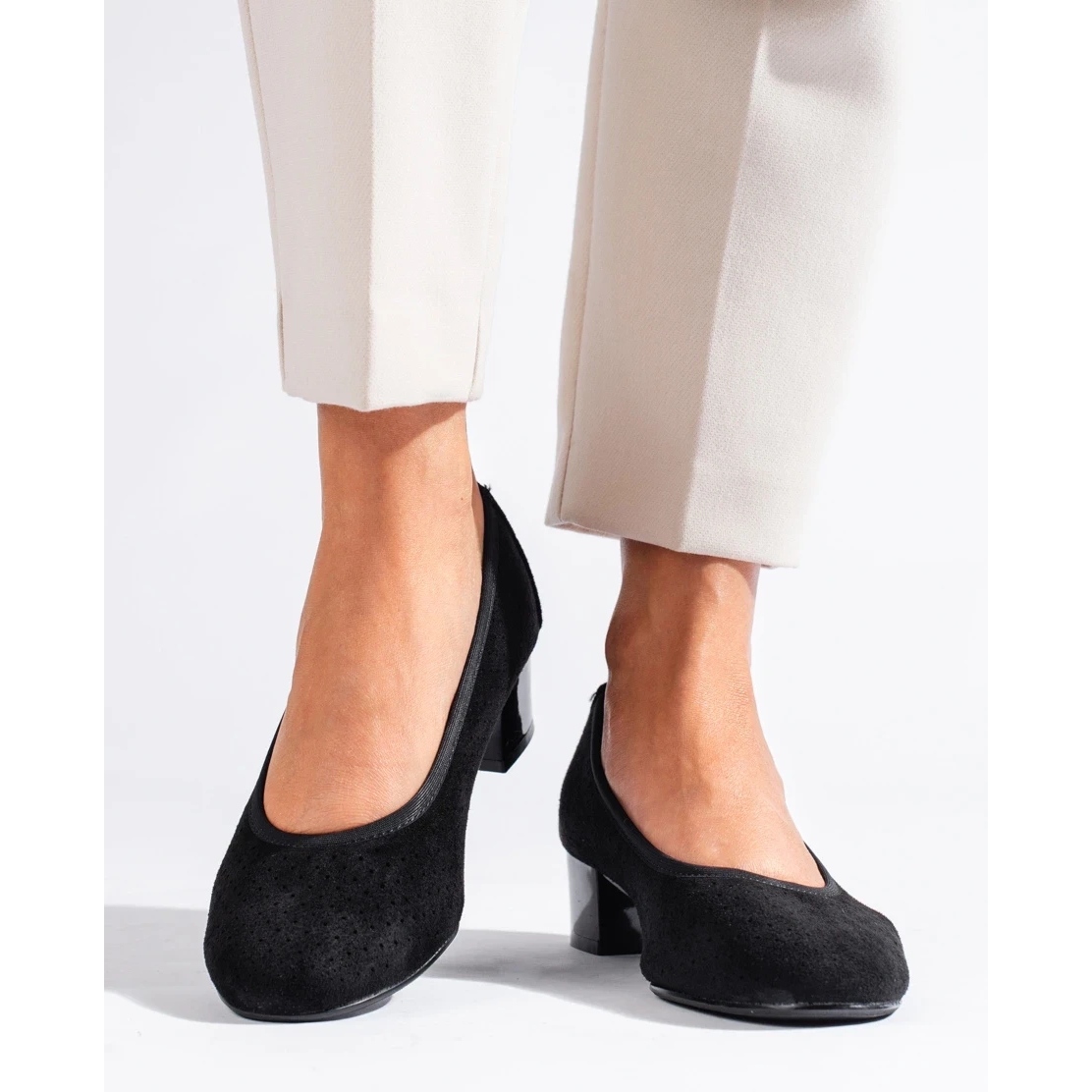 Produits par la célèbre marque W. Potocki, ces escarpins sont destinés aux femmes qui apprécient le style classique avec une touche d'originalité. Noirs, fabriqués en daim écologique de haute qualité, ils constituent une excellente base pour de nombreux styles. Leur couleur universelle et leur design classique les rendent assortis à la plupart des tenues, des jeans de tous les jours aux robes élégantes.