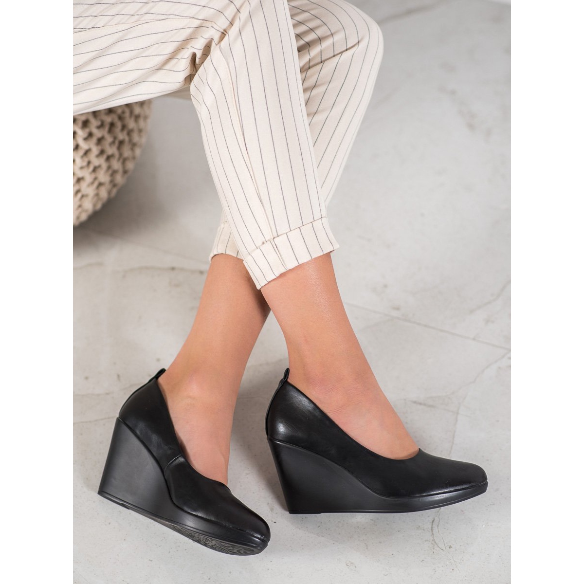 Confectionnées en cuir écologique, elles sont extrêmement élégantes et leur bout rond ajoute de la subtilité. La semelle intérieure en cuir naturel assure le plaisir de porter, et la cale de 8,5 cm garantit stabilité et confort tout au long de la journée. De plus, la semelle synthétique lisse rend les escarpins légers et flexibles à utiliser.