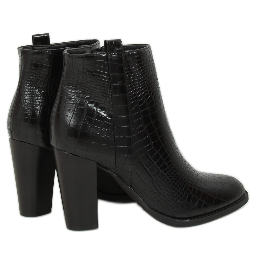 Nous vous présentons des bottines noires à talons hauts extrêmement stylées et élégantes qui correspondent parfaitement aux tendances de la mode actuelles. Le modèle avec motif peau de serpent est une proposition idéale pour les femmes qui apprécient l'originalité et l'extravagance. Une finition de haute qualité en cuir écologique brillant et une fermeture éclair latérale pratique rendent les bottes non seulement attrayantes, mais aussi pratiques au quotidien.