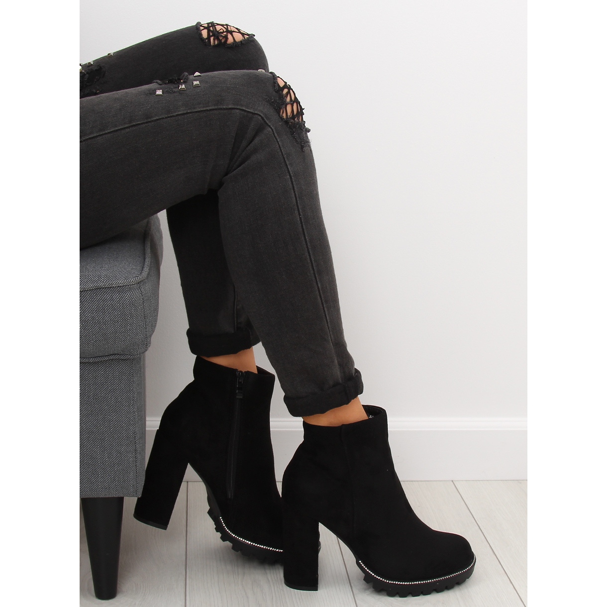Bottes pour femmes 58-581 de style Black II-GAT et sensualité avec un léger inconvénient. Fabriqué en daim écologique en noir classique, ils combinent l'élégance avec un accent distinct: une plate-forme trappenée (2 cm) décorée de zircons ajoute de la brillance, et un simple talon du piston de 10 cm de haut allonge optiquement les jambes. Le TOE aux amandes met l'accent sur la ligne de pied féminine, et la fixation de zip pratique sur le côté facilite la mise en place. Le réchauffeur sous la forme d'une doublure en mousse offre un confort supplémentaire les jours plus frais.