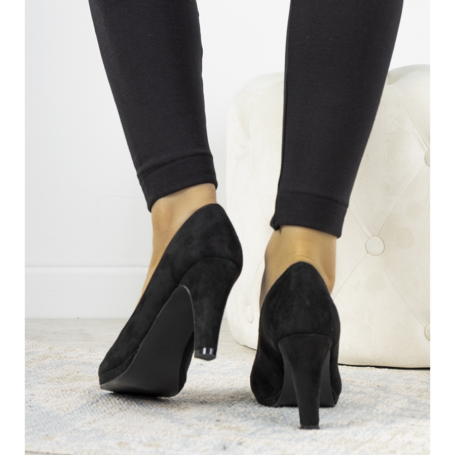 Les escarpins noirs à talons hauts en éco-cuir Sara sont le choix parfait pour les femmes qui apprécient l'élégance et le confort. Fabriqués en cuir suédé écologique de haute qualité, ils offrent non seulement un look élégant, mais également un confort de port. La coupe classique au bout subtilement arrondi affine optiquement le pied, et le talon de taille moyenne met parfaitement en valeur les jambes, leur apportant de l'élégance.