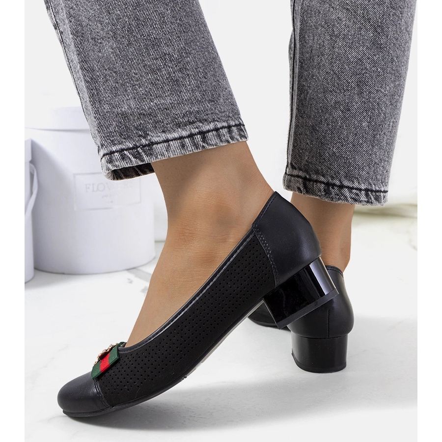 Les escarpins noirs ajourés sont un choix parfait pour les femmes qui apprécient l'élégance et le confort. Ces chaussures uniques se distinguent par une fabrication de haute qualité et des détails raffinés qui attirent le regard. Un ruban vert et rouge avec un nœud papillon décoratif leur donne un caractère unique et en fait un complément parfait à n'importe quel style.