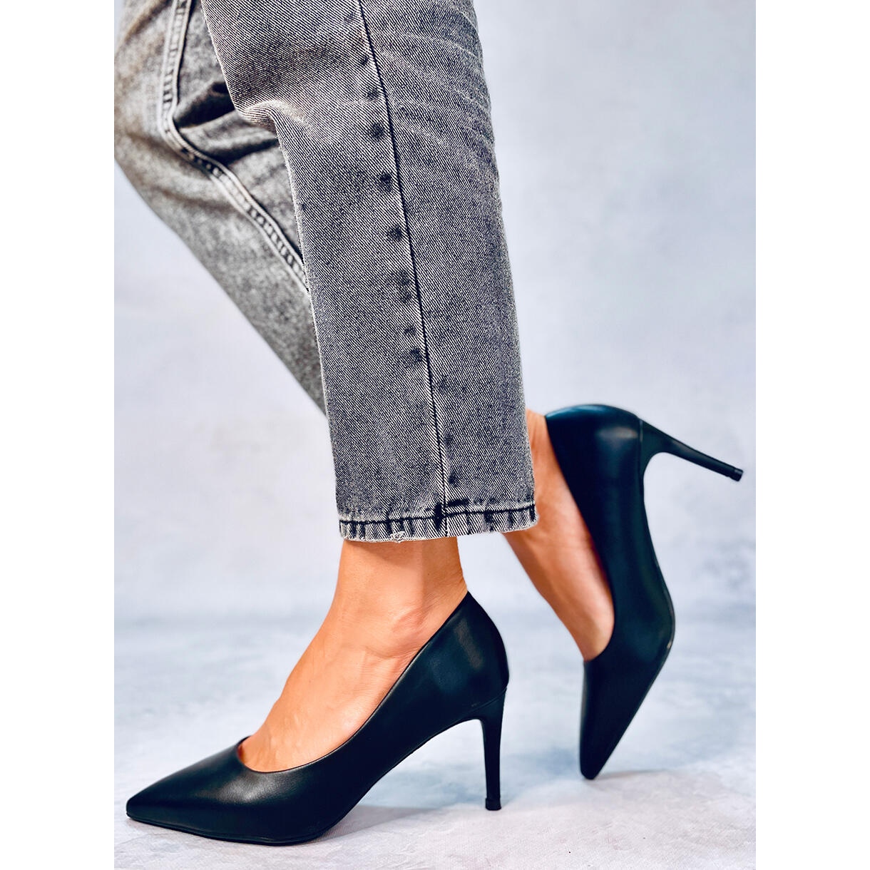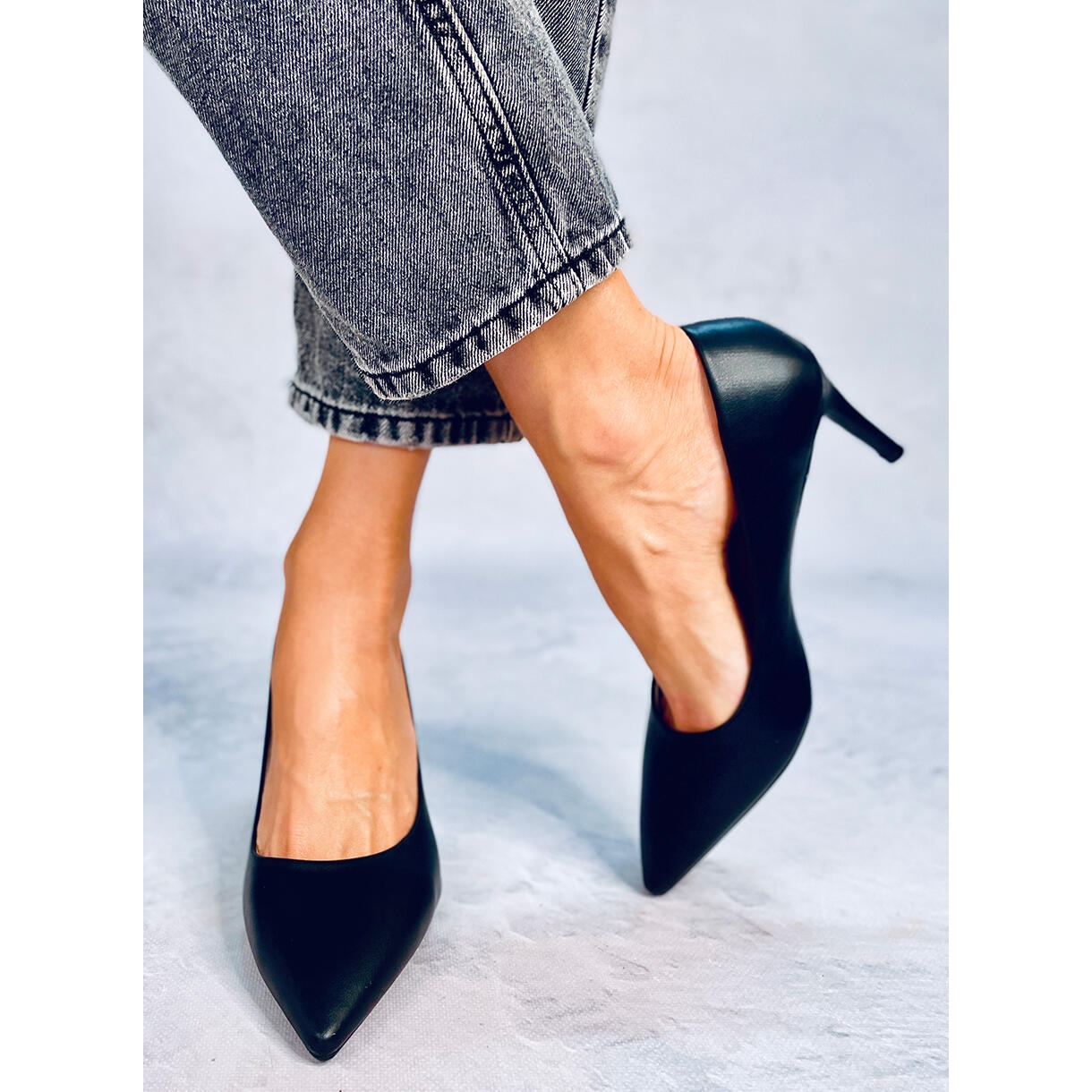 Les talons aiguilles noirs classiques Shannon Black sont des escarpins pour femmes élégants avec un talon de 8 cm, parfaits pour un usage quotidien et plus encore. Elles se caractérisent par un design simple et intemporel avec des bouts galbés légèrement pointus. Les chaussures sont fabriquées en cuir fleur écologique, ce qui garantit leur solidité et leur durabilité. Les talons hauts sont sans motif, noirs, avec une semelle noire.