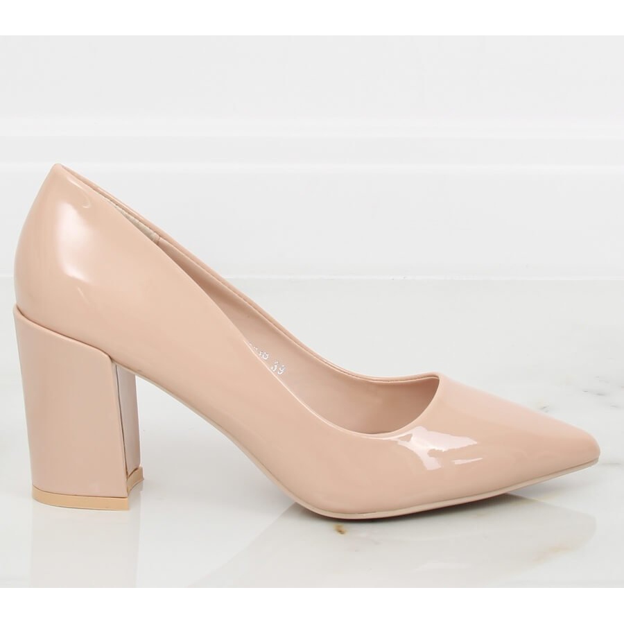Les pompes des femmes élégantes avec un type de talon stable avec une hauteur de 8,5 cm. La coupe classique et galbée avec un nez pointu et une finition verni combine parfaitement l'élégance intemporelle avec les fonctionnalités quotidiennes. Fabriqué en cuir écologique dans une couleur beige universelle - idéal pour le travail, pour une réunion ou des sorties plus formelles.