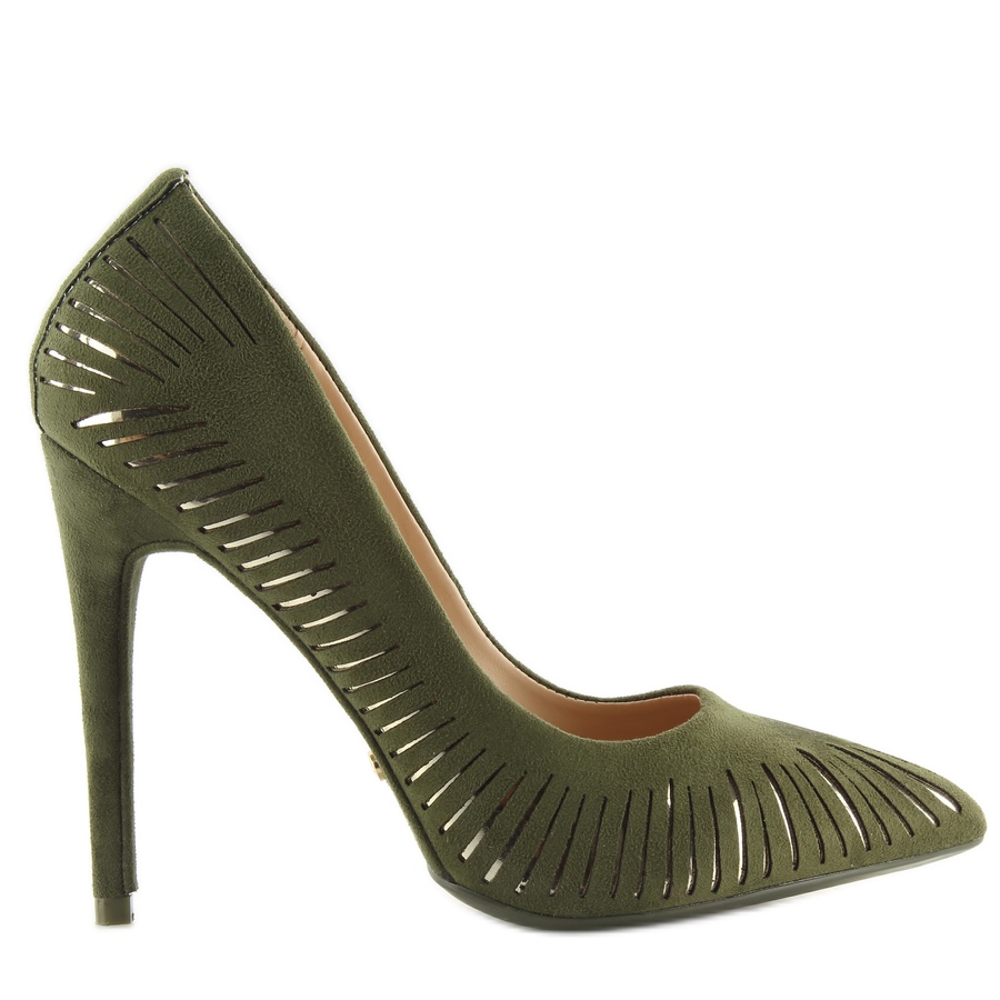 Découvrez l'élégance et le style unique des escarpins à talons hauts LE016P Olive dans une ravissante teinte verte. Ces chaussures pour femmes uniques au talon fin de 11 cm allient design moderne et confort de port. Fabriqués en daim écologique, les escarpins attirent l'attention avec des découpes ajourées et des accents argentés brillants, ce qui leur donne de l'originalité.