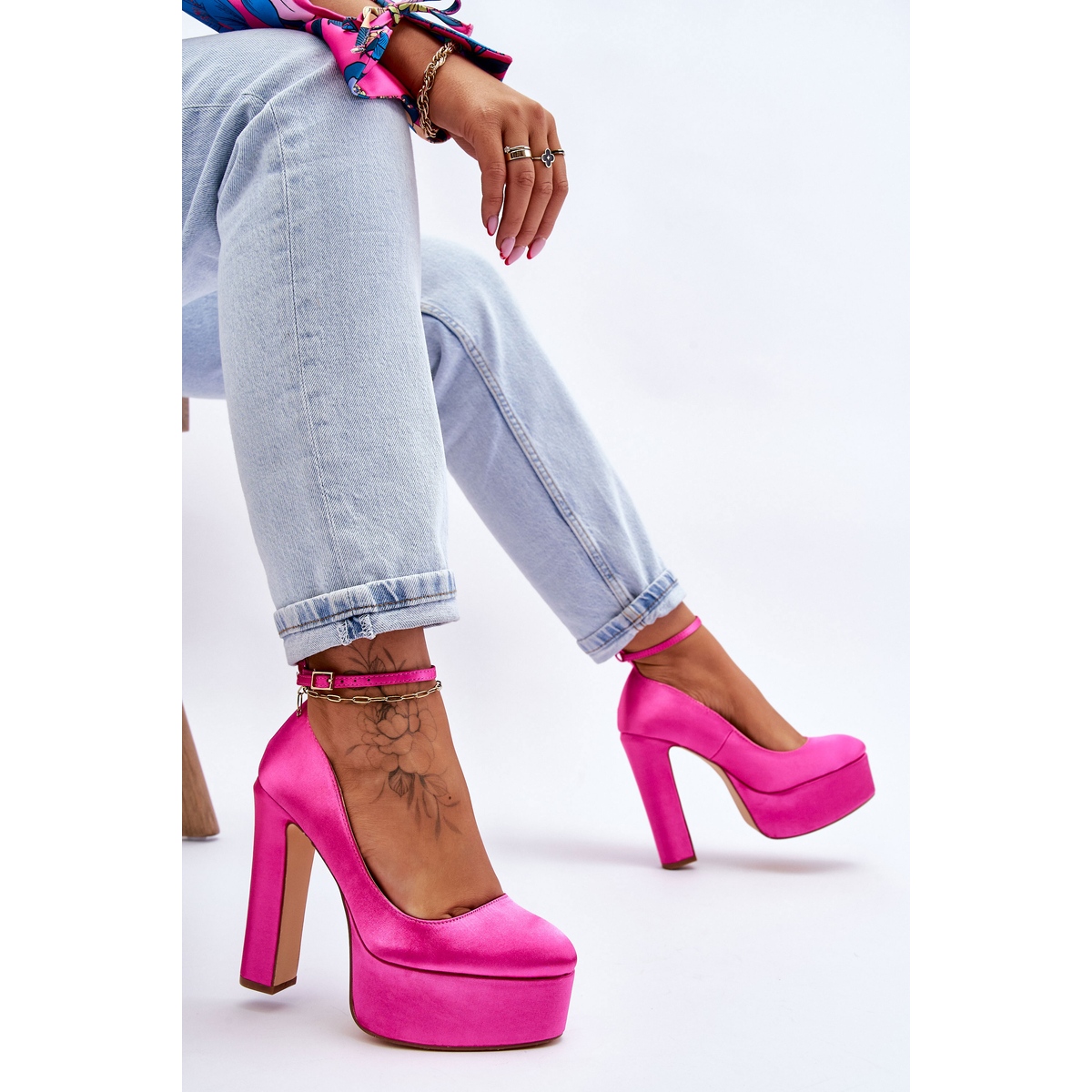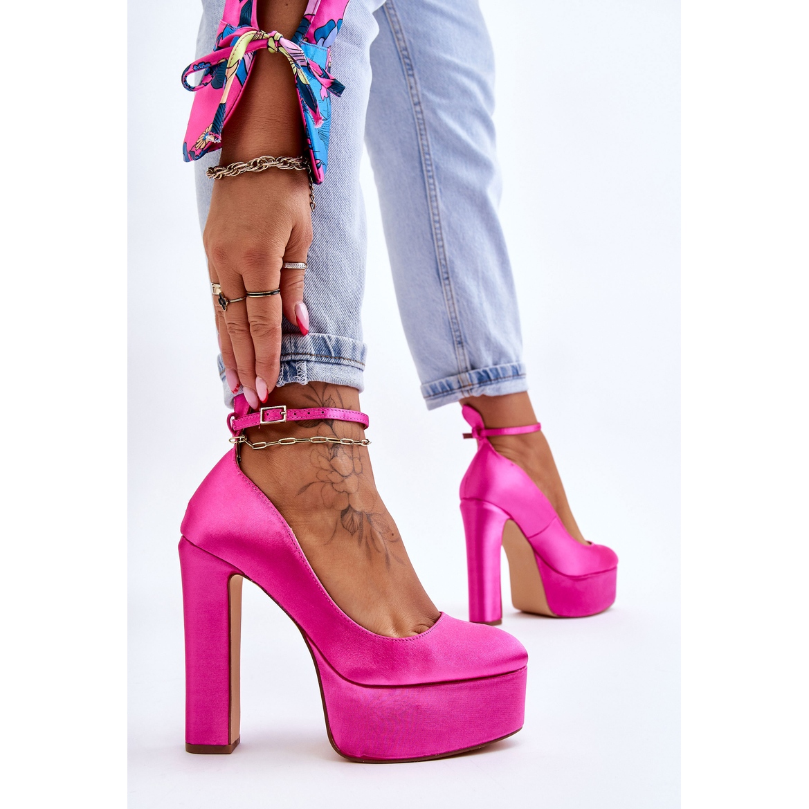 Le design de ces escarpins est une combinaison d'un élégant talon bloc de 13,5 cm de haut et d'une plateforme massive et stabilisatrice de 5 cm de haut. Grâce à cela, les chaussures acquièrent un caractère unique et permettent une marche confortable, malgré leur hauteur impressionnante. La tige de 5,5 cm de hauteur s'intègre parfaitement dans le design global, créant un look harmonieux et équilibré.