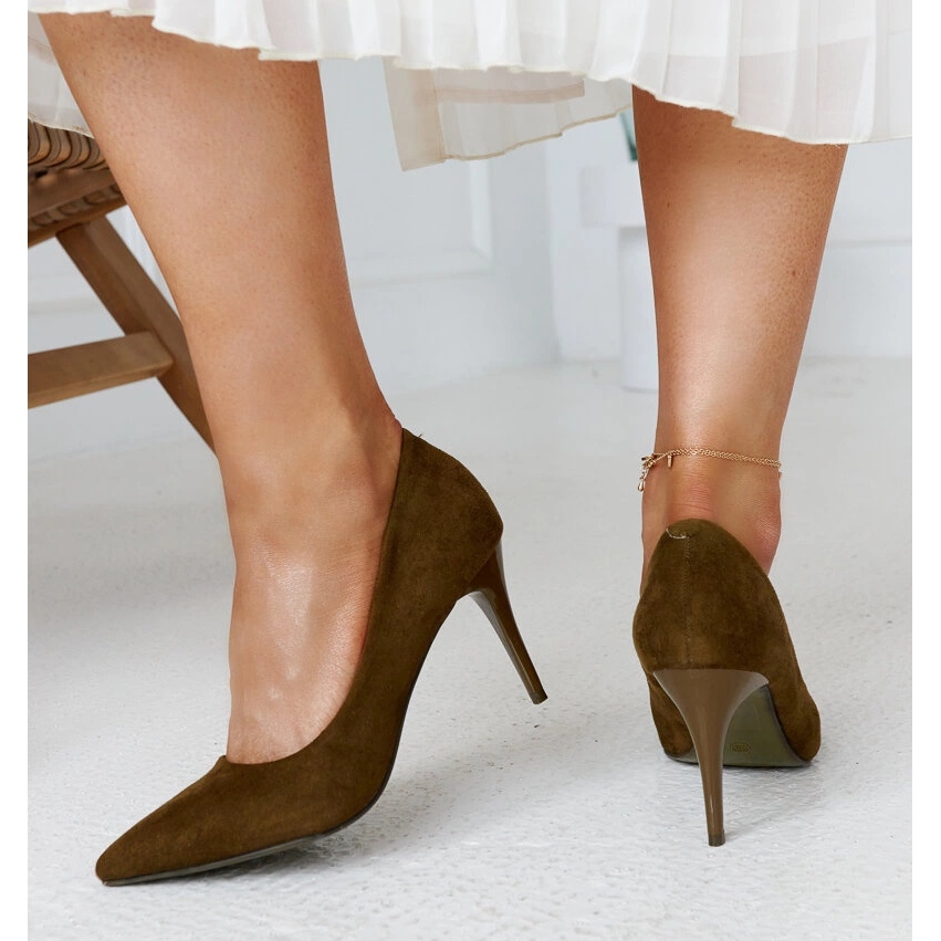 Fabriquées en cuir écologique de haute qualité avec une finition en daim, ces superbes chaussures attireront certainement l'attention avec leur couleur vert foncé profond, que le fabricant a appelée « Dark Olive ». Ce choix de couleurs permet aux talons hauts de s'associer parfaitement aussi bien à une robe de soirée qu'à une tenue plus décontractée, en y ajoutant classe et élégance.