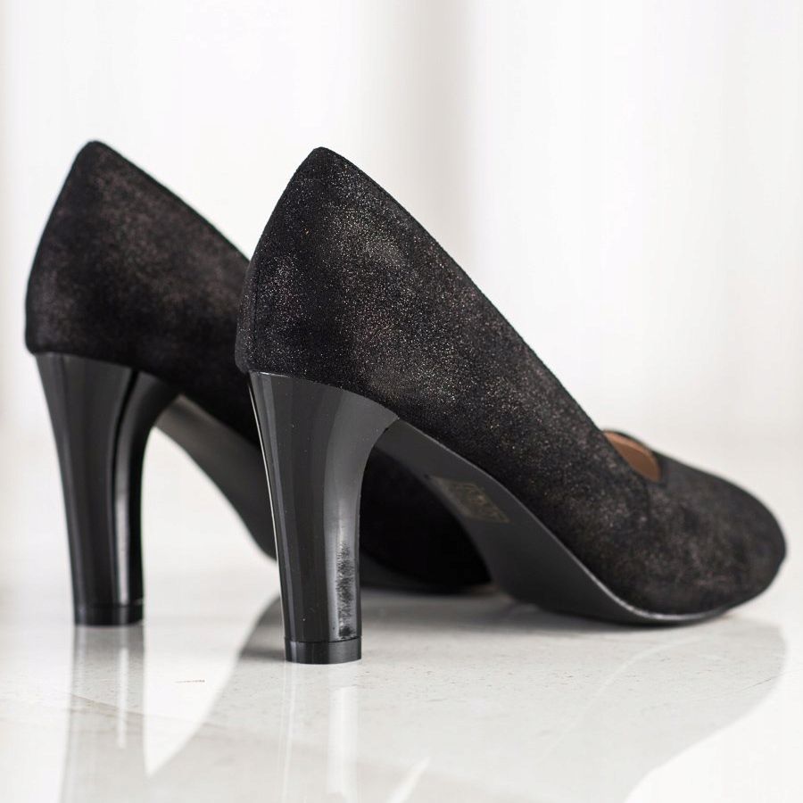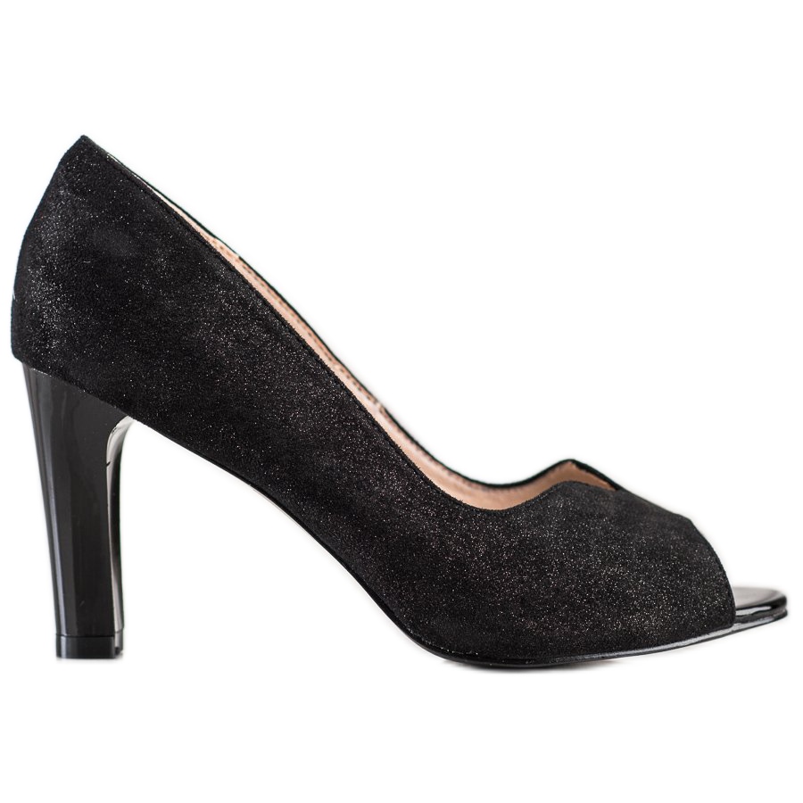 La tige des escarpins est faite d'un matériau semblable à du cuir suédé noir, qui scintille de paillettes et ajoute un éclat unique aux styles de tous les jours et de soirée. Les bouts ouverts et arrondis ajoutent légèreté et élégance aux chaussures, les rendant parfaites pour tous types de célébrations et de fêtes.