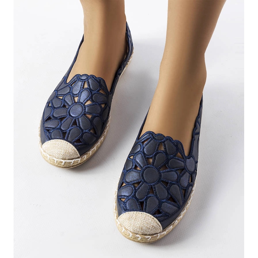 Le produit est des espadrilles ajourées bleues. Un accessoire de mode pour chaque femme, inspiré du style marin, parfait pour les journées chaudes. Chaussures pour femmes dont la couleur du fabricant est spécifiée comme « Navy », qui est une nuance de bleu marine. Elles se caractérisent par une tige tricotée et ajourée qui laisse respirer la peau.