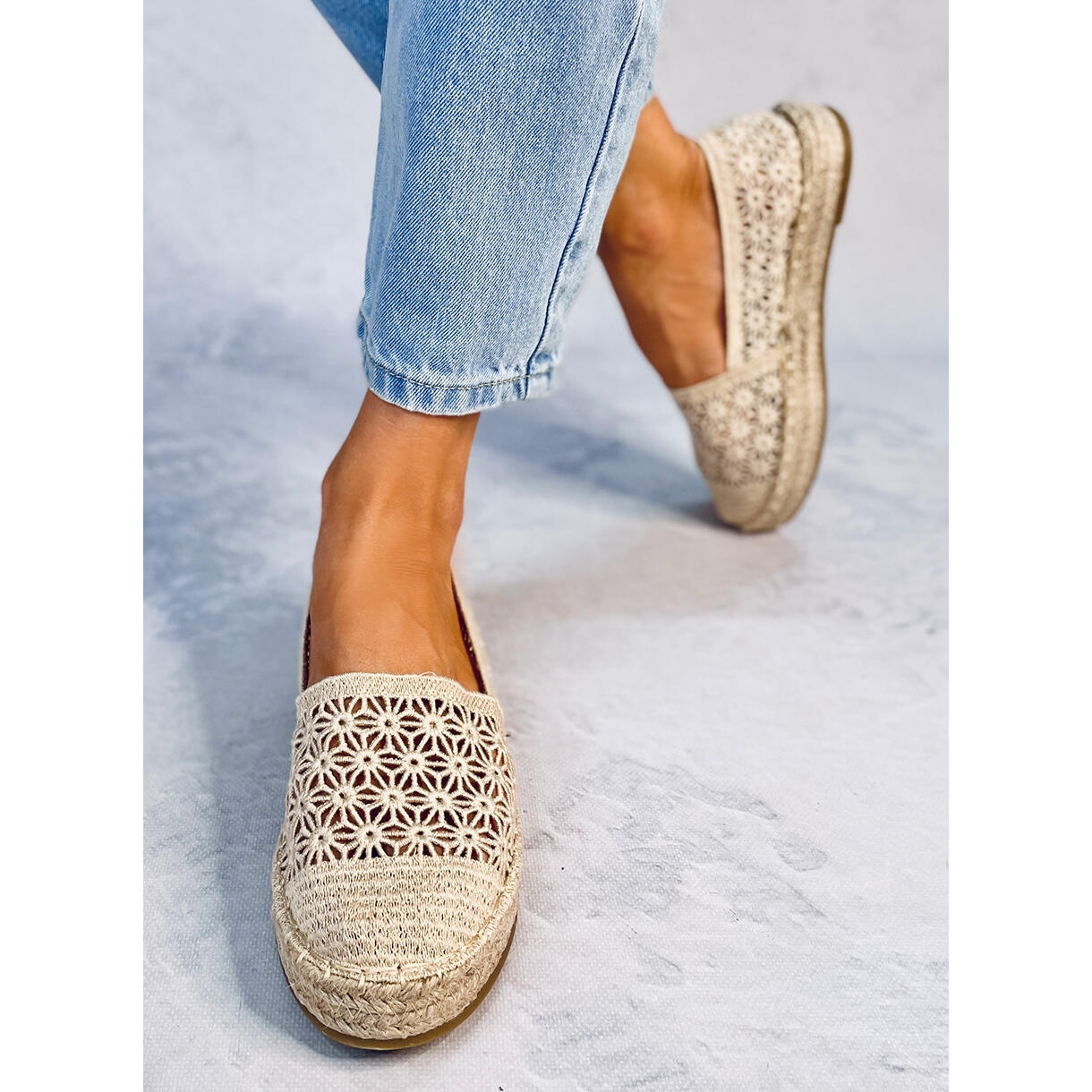 La tige des chaussures est constituée de lacets aérés, qui non seulement attireront l'attention, mais fourniront également à vos pieds la ventilation nécessaire pendant vos aventures de vacances. Ce détail rend les espadrilles uniques et souligne leur caractère délicat. La couleur beige, synonyme d'élégance et d'universalité, garantit que les chaussures s'associeront à de nombreux ensembles - des robes d'été aux shorts amples.