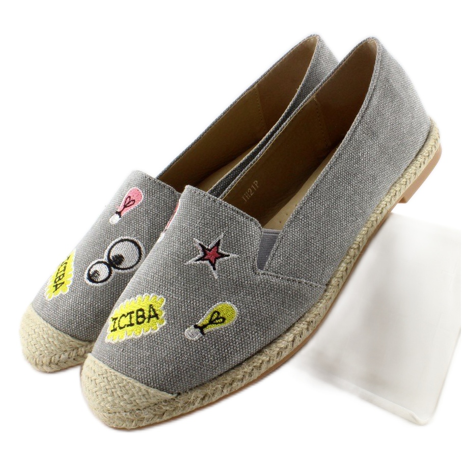 Découvrez la mode et le confort avec les espadrilles grises avec patchs JH21p d'Inna Marka. Ces chaussures pour femmes extrêmement élégantes présentent un design unique qui attirera certainement l'attention. De charmants patchs en forme d'ampoules et d'yeux ajoutent un caractère joyeux aux espadrilles, ce qui en fait un complément parfait au style de tous les jours.