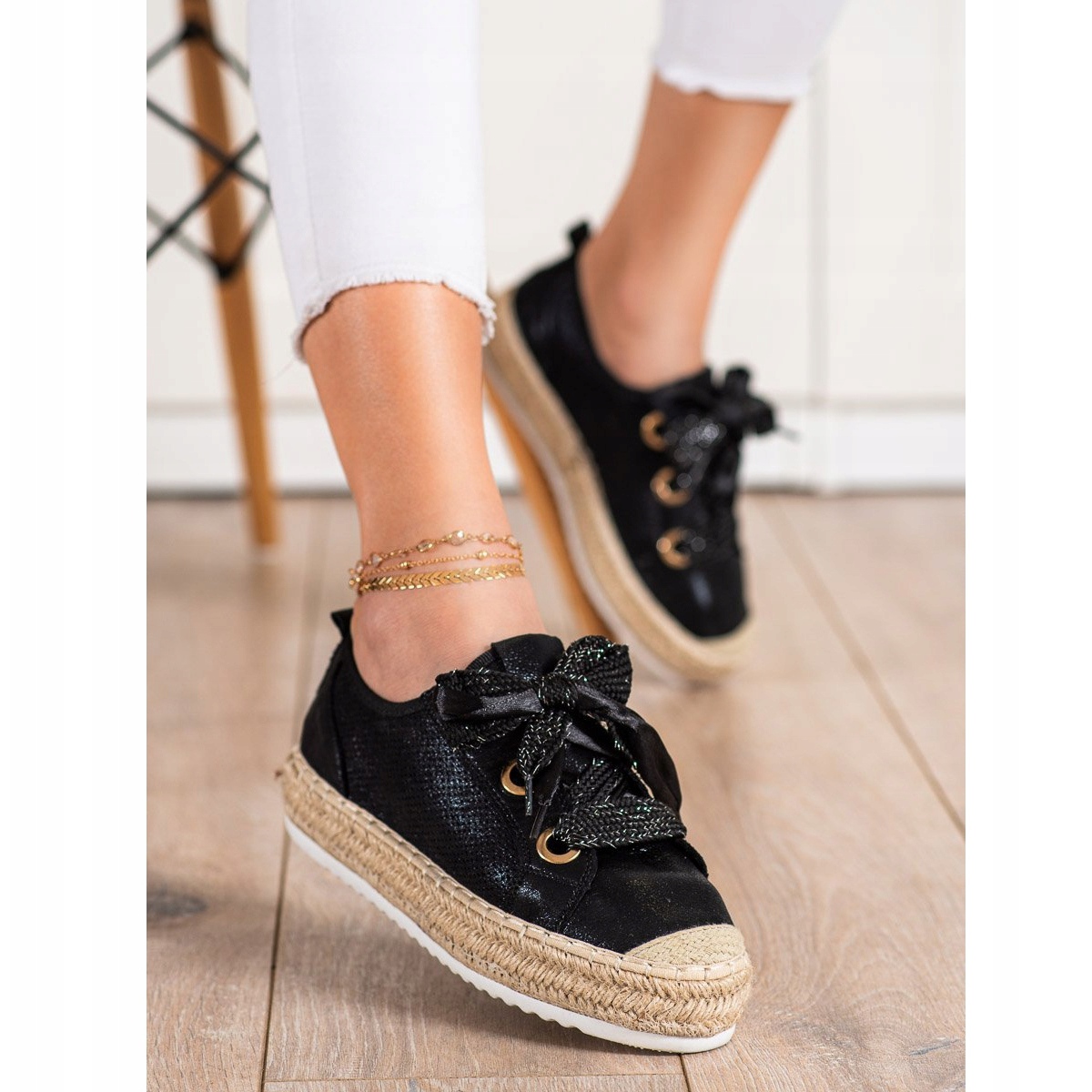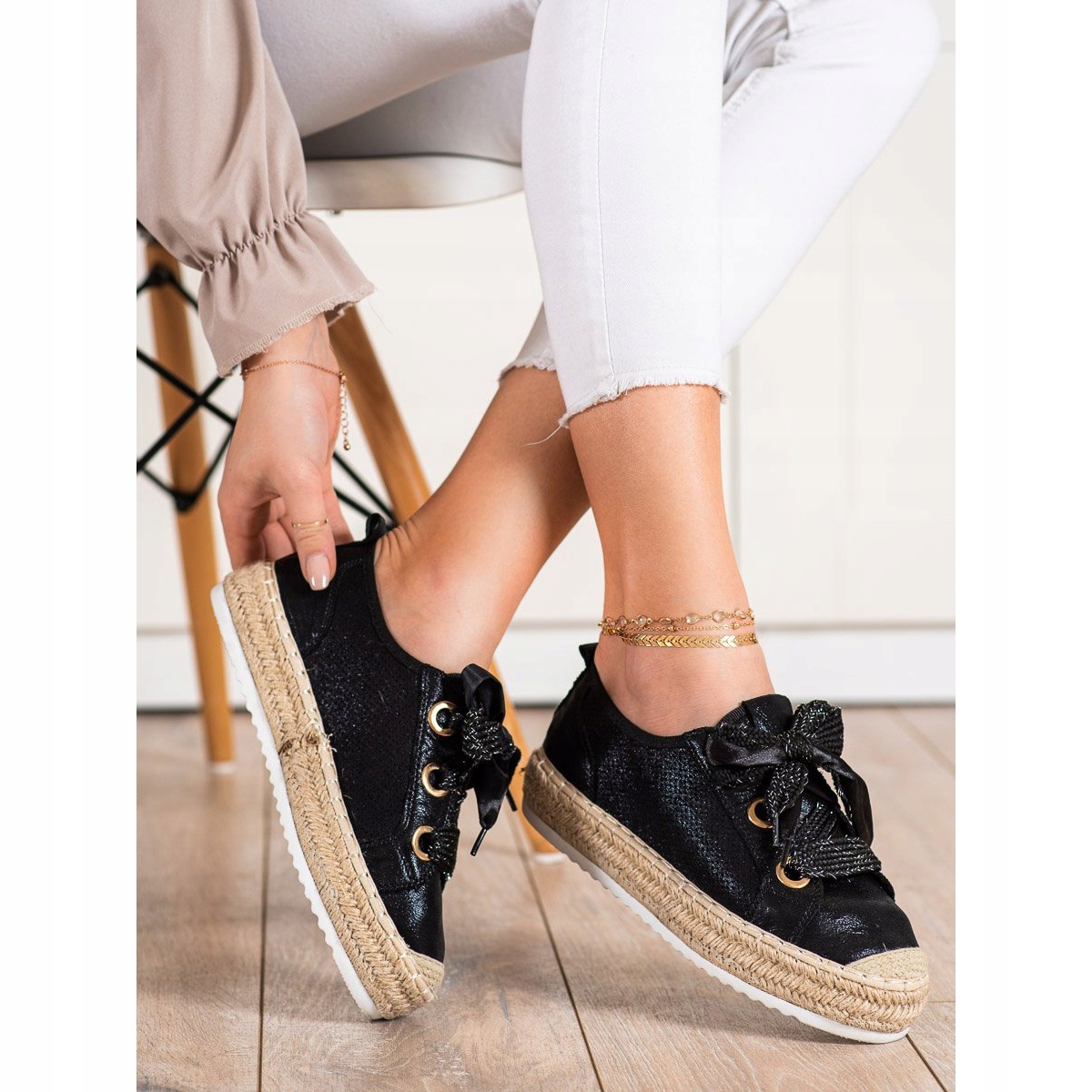 Leur couleur noire universelle les rend parfaitement assortis aux pantalons, jupes de sport et robes. Fabriquées en cuir écologique, ces chaussures sont non seulement élégantes mais aussi respectueuses de l'environnement. Grâce à l'insert textile, les espadrilles sont agréables à porter et le talon souple intégré assure la stabilité pendant le port.