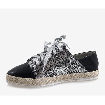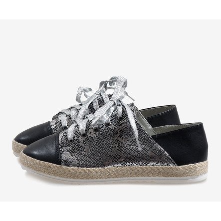 Découvrez une nouvelle dimension de style avec les baskets espadrilles noires TL-39, un choix idéal pour les femmes modernes qui apprécient l'élégance et le design unique. Ces chaussures à lacets noires et argentées associent une coupe classique à des empiècements avant-gardistes imitant la peau de serpent, ce qui les rend parfaitement en phase avec les dernières tendances de la mode.
