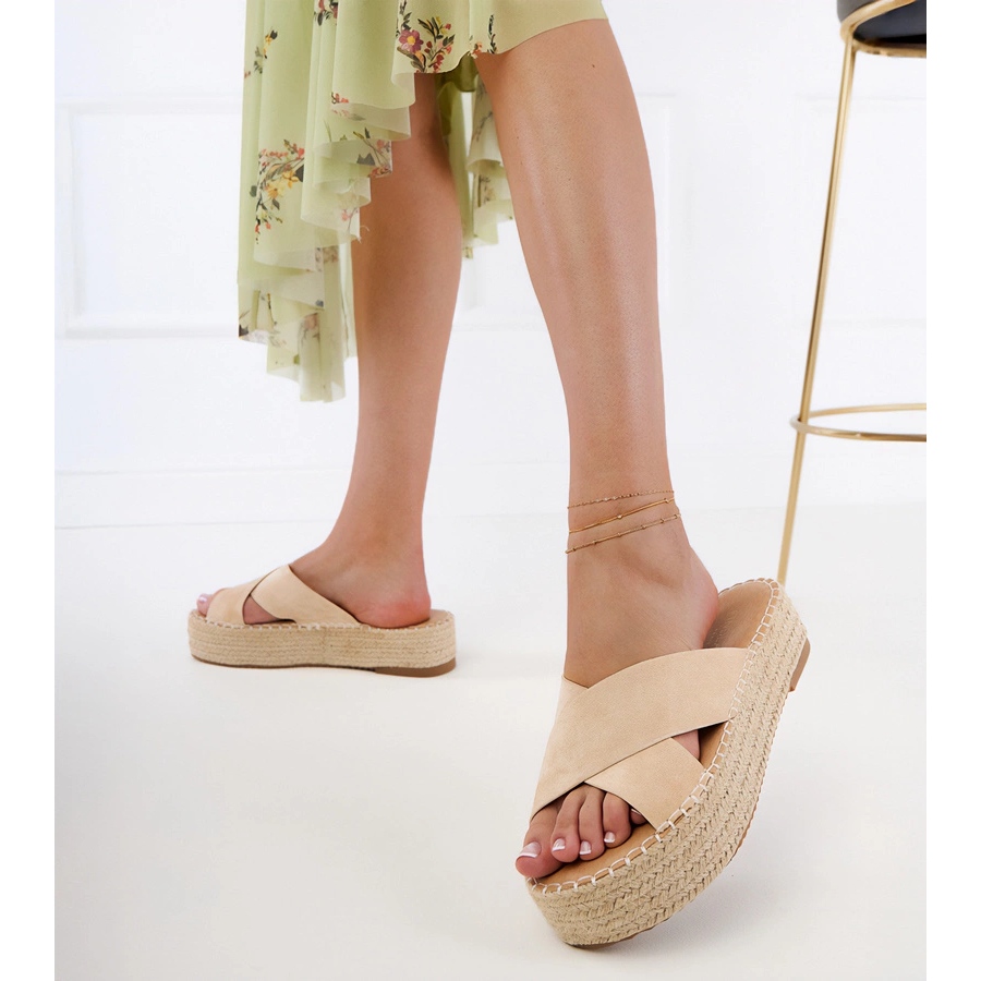 La semelle brune en plastique garantit non seulement la durabilité, mais aussi la bonne adhérence, ce qui fait de ces tongs le choix parfait pour les promenades d'été et les sorties décontractées. Les Espadrilles Beige se mélangent parfaitement avec diverses stylifications - des robes aérées, en short en jean classique.