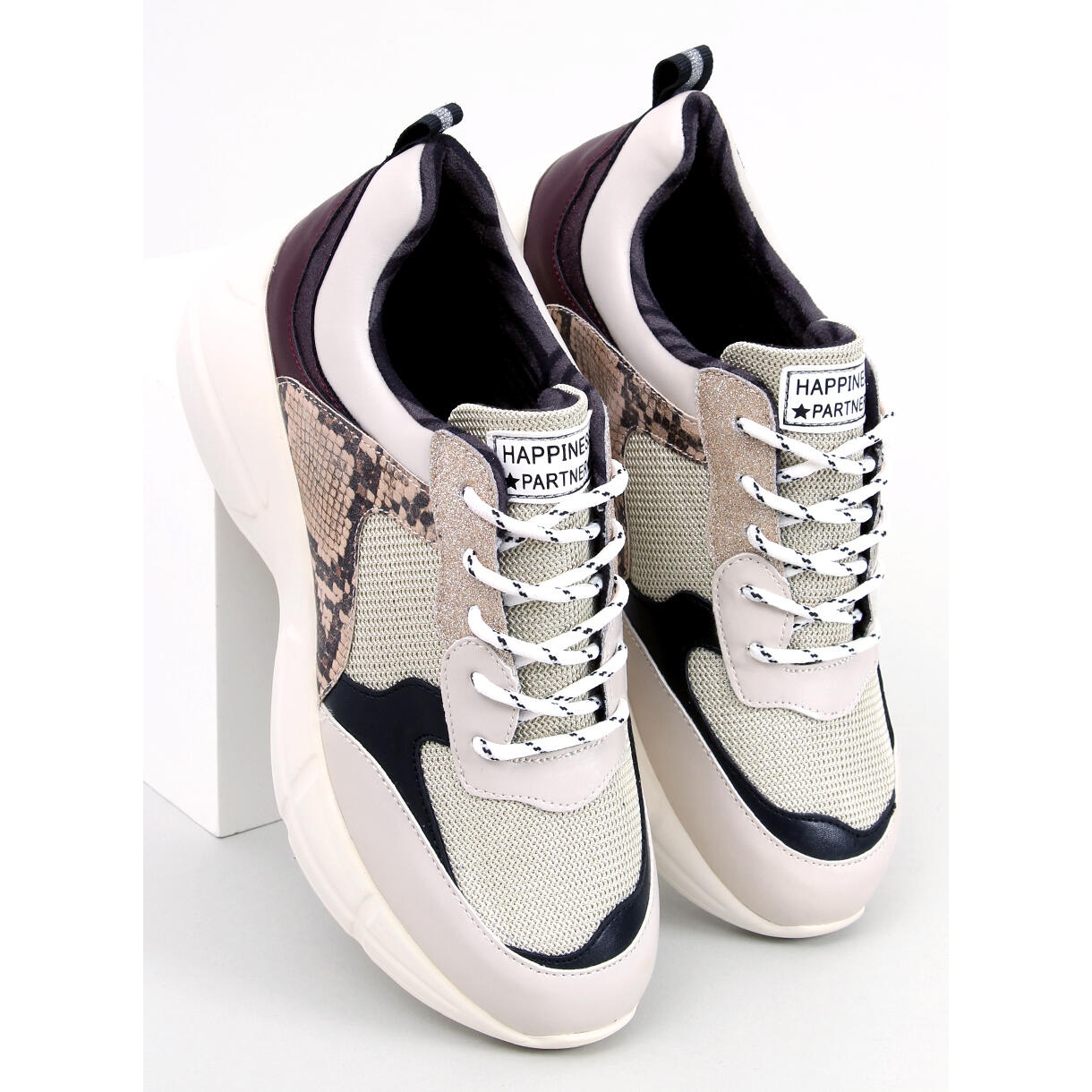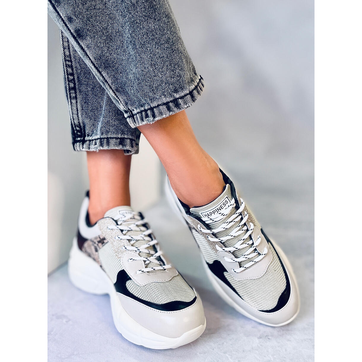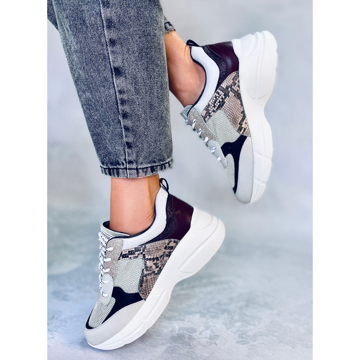 Ces chaussures de sport uniques à semelle haute ont acquis une élégance supplémentaire grâce à des détails uniques : les inserts scintillants ainsi que le motif peau de serpent en font la décoration principale de tout style. Ce ne sont pas des baskets ordinaires, ce sont des chaussures pour une femme qui valorise l'originalité et est au courant des tendances de la mode.