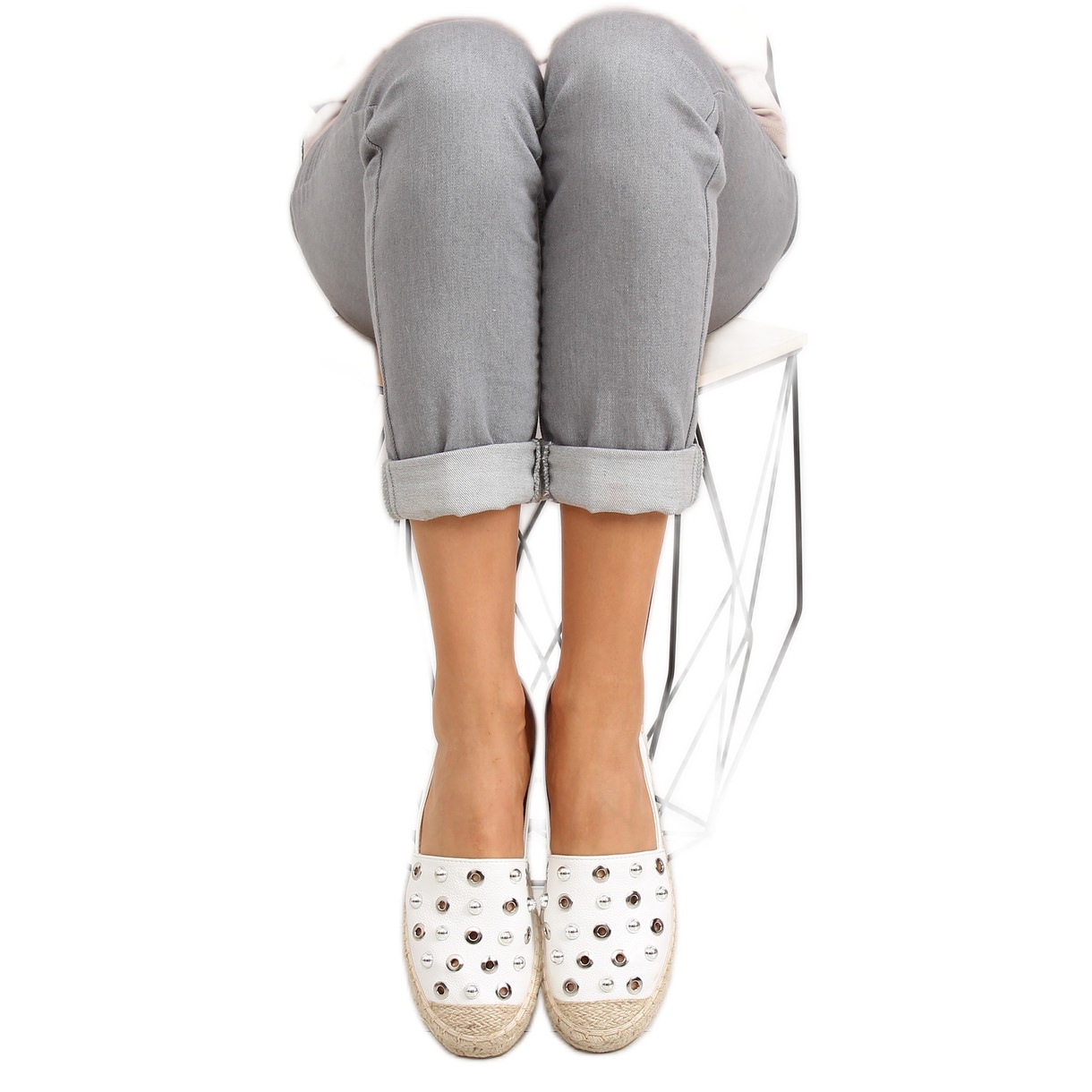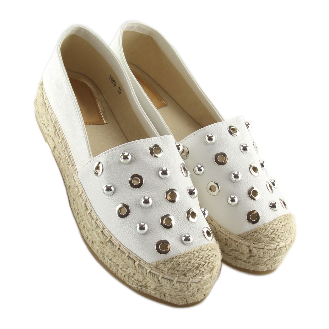 Découvrez les espadrilles blanches pour femmes 7680 blanc - le choix parfait pour les journées d'été ! Ces chaussures uniques à semelles hautes allient élégance et confort, ce qui en fait un complément parfait à n'importe quel style. Le cordon tressé autour de la semelle et sur le bout leur confère légèreté et subtilité, tandis que les clous décoratifs et les anneaux argentés introduisent une note d'originalité qui attire le regard.